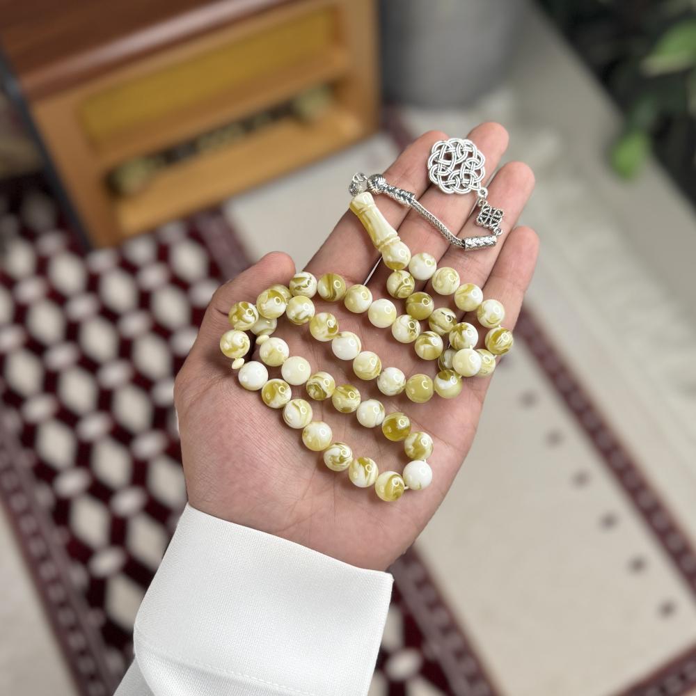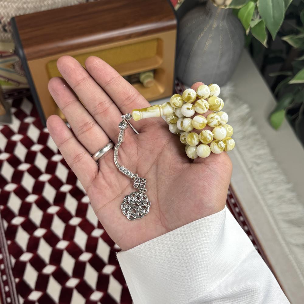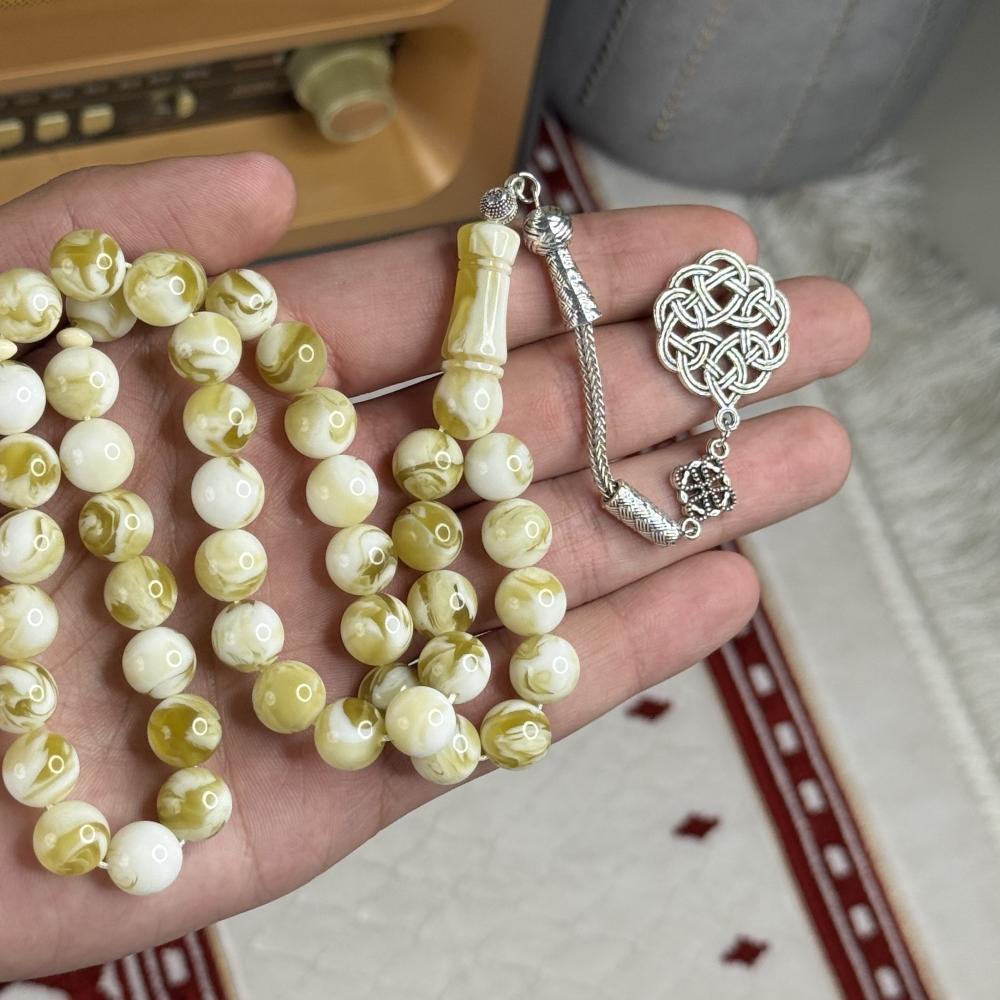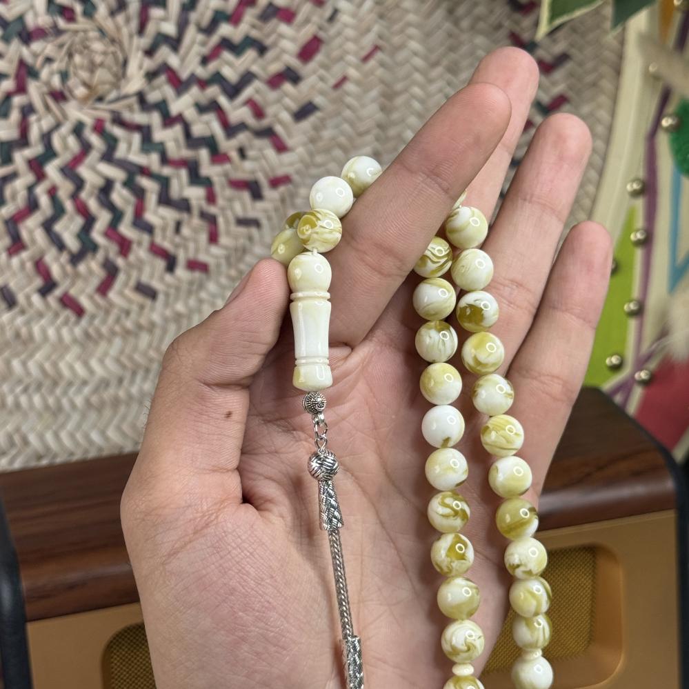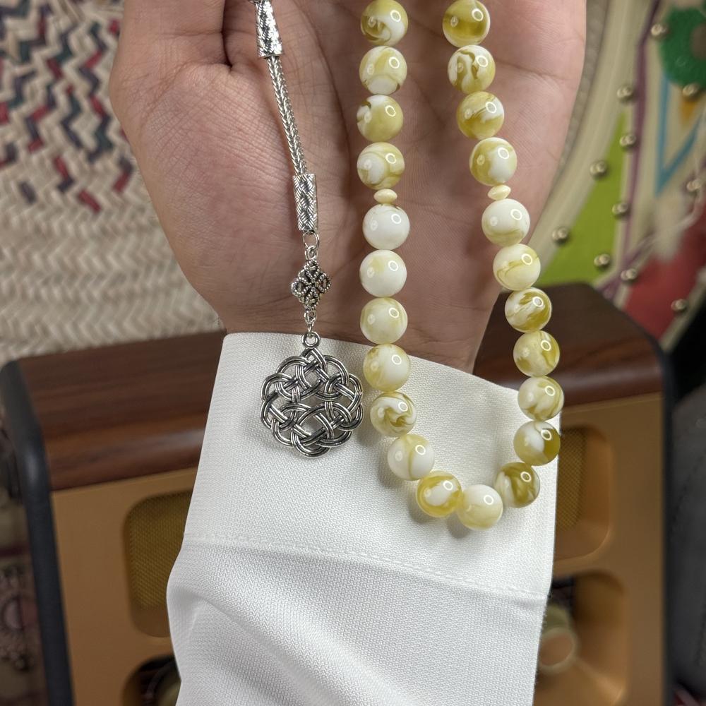 الخامة مايسمى بالبكلايت خفيفة الوزن مصممة للاستخدام اليومي، تتميز بتصميم مريح وأنيق و عصري ، عليها طربزونة معدنية مصنوعة يدوياً مما يعطي السبحة جمال وفخامة وجمال