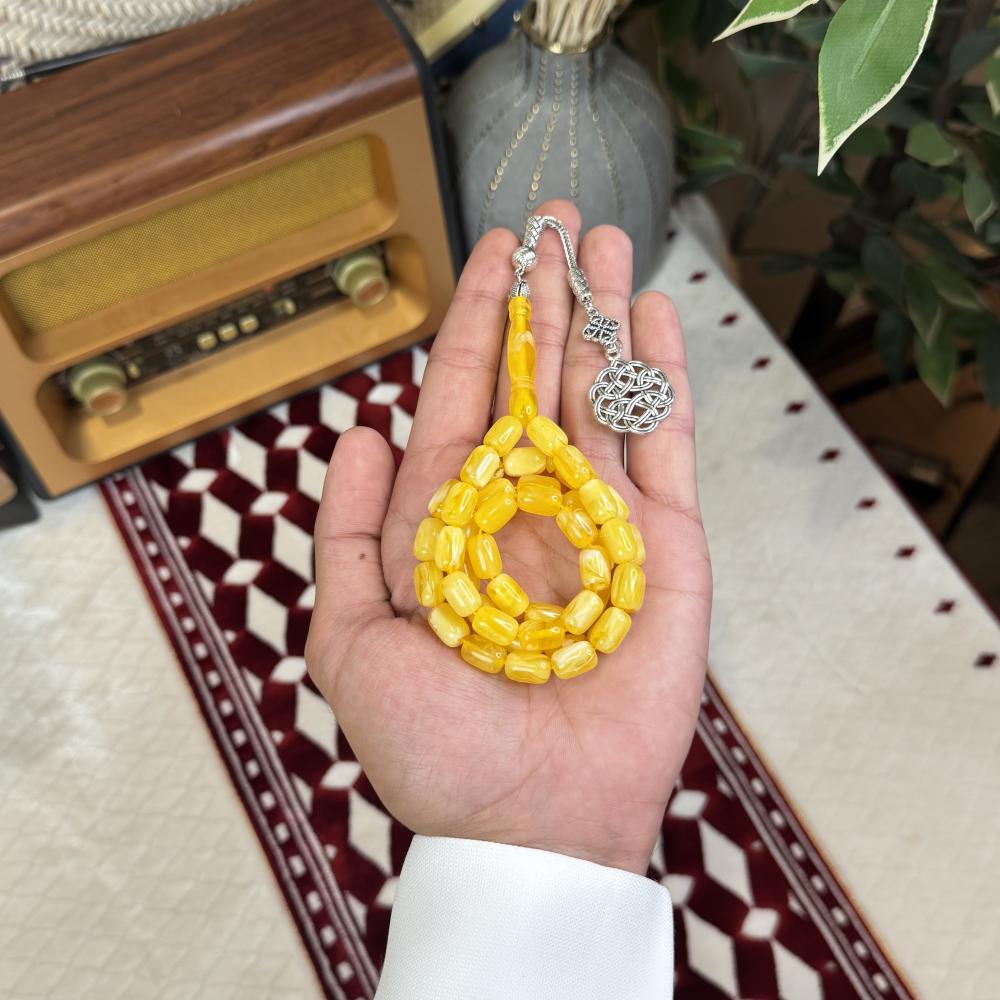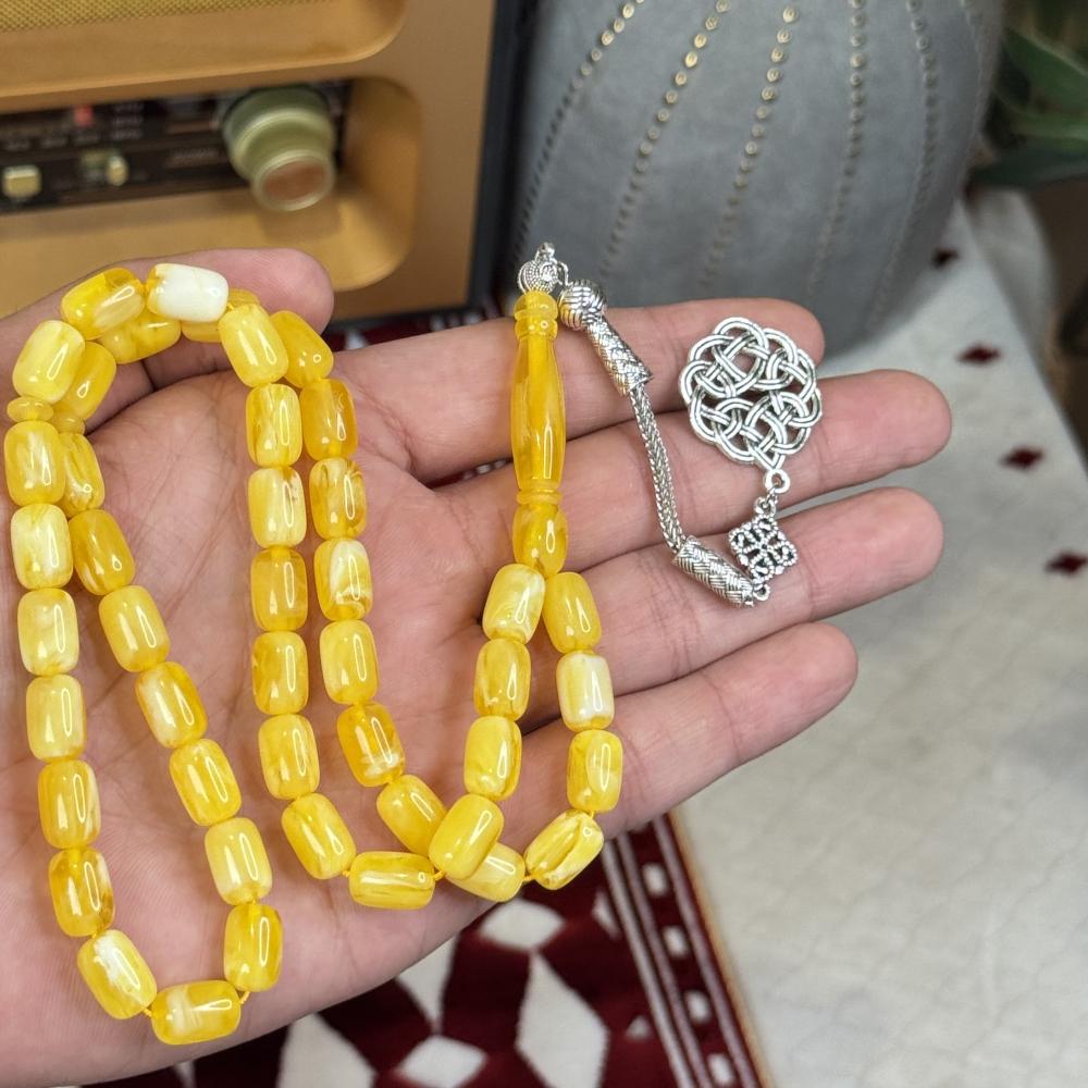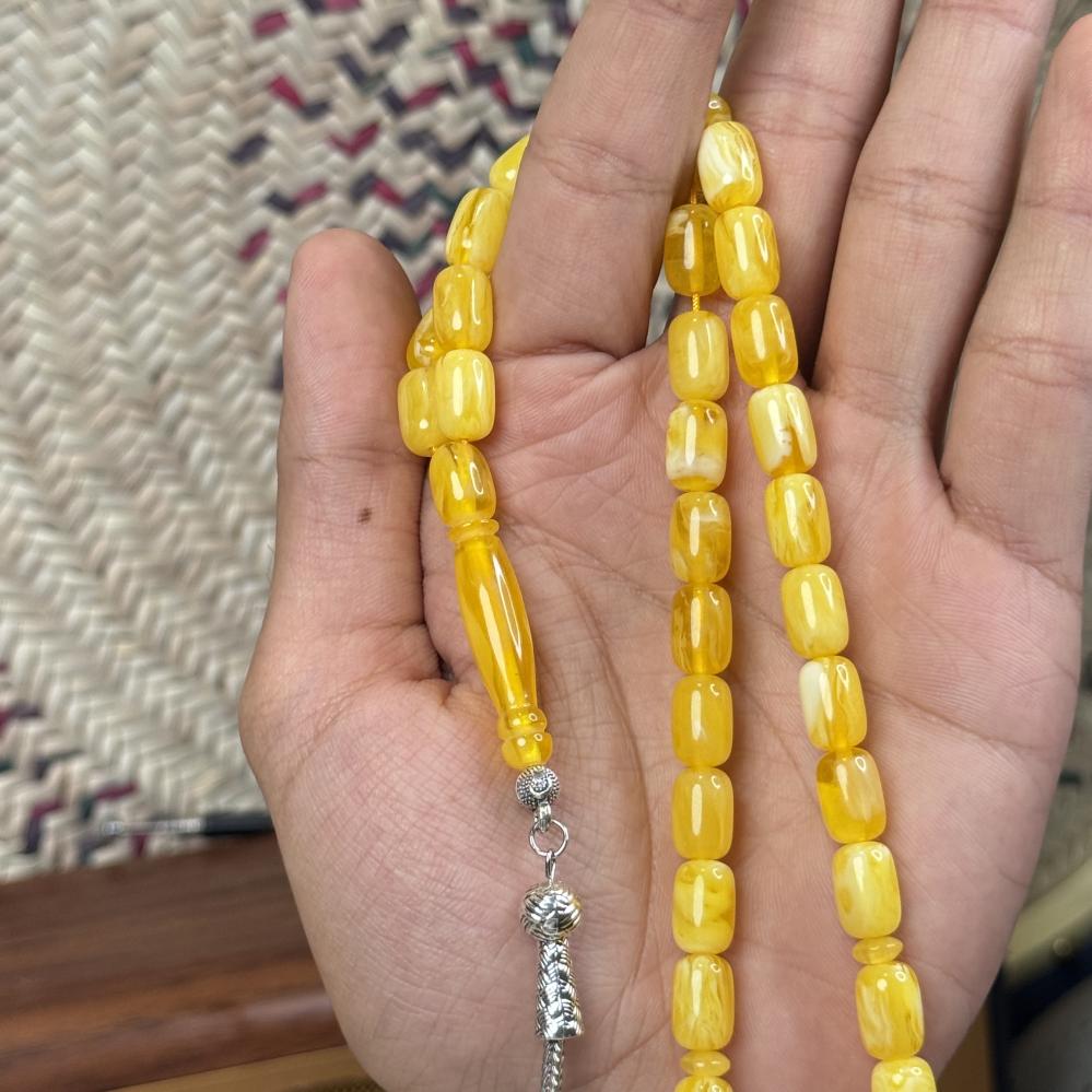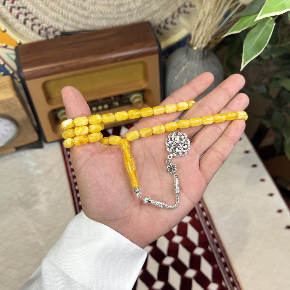 الخامة مايسمى بالبكلايت خفيفة الوزن مصممة للاستخدام اليومي، تتميز بتصميم مريح وأنيق و عصري ، عليها طربزونة معدنية مصنوعة يدوياً مما يعطي السبحة جمال وفخامة وجمال