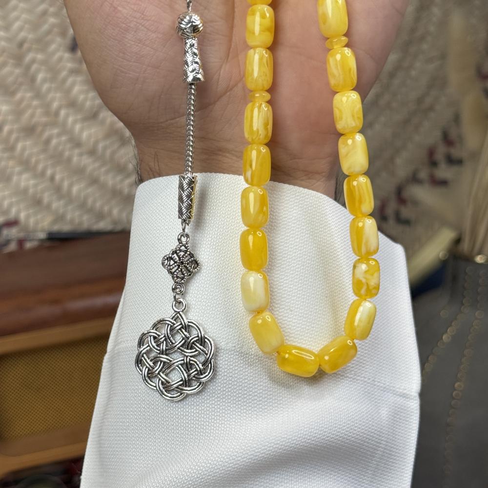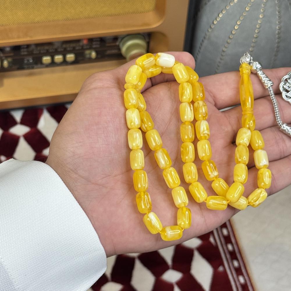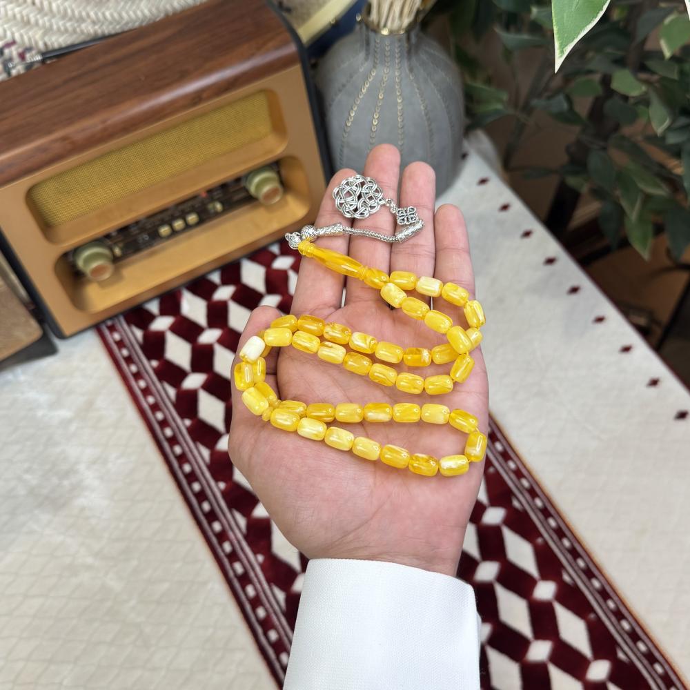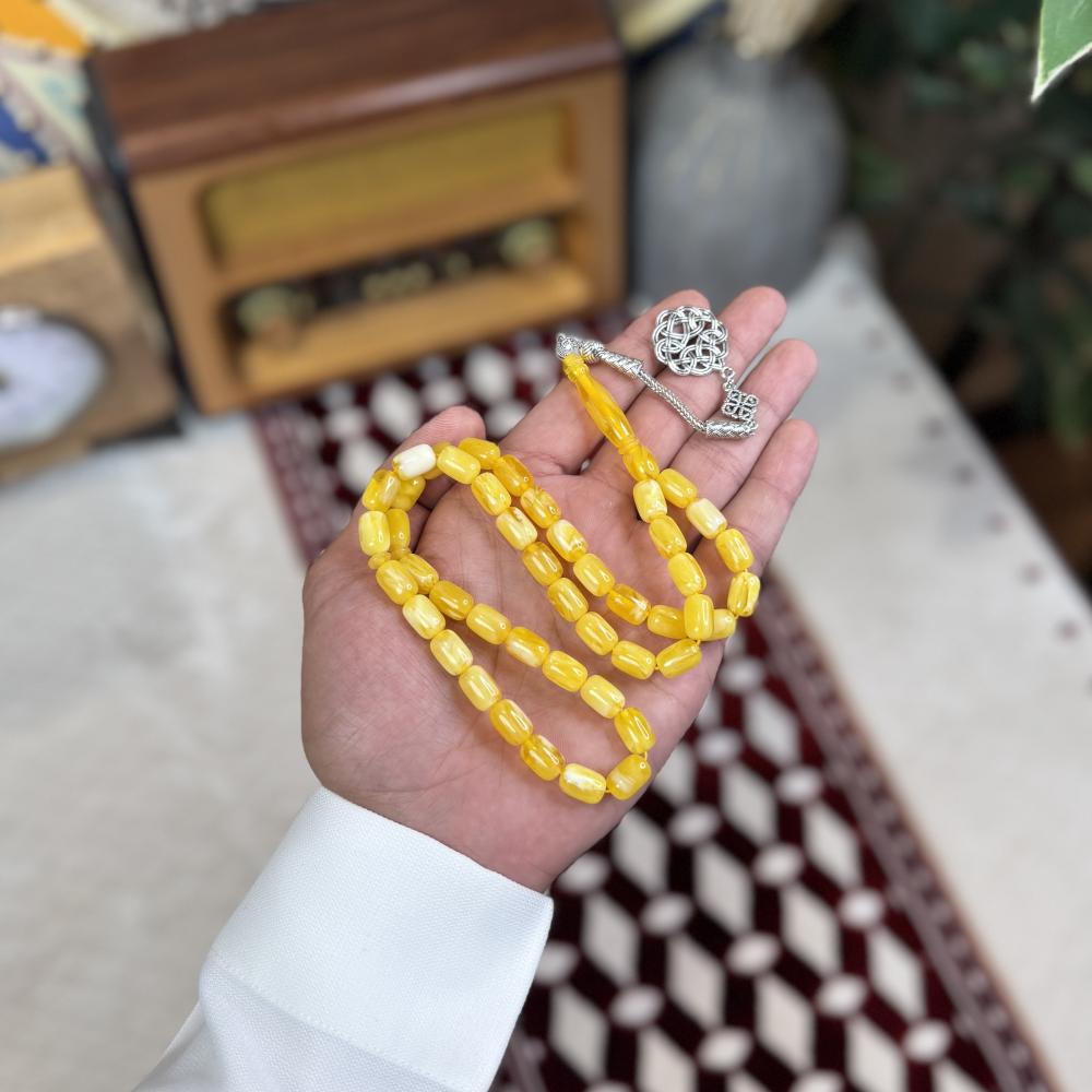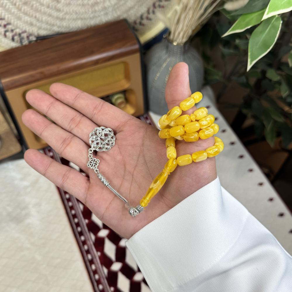 الخامة مايسمى بالبكلايت خفيفة الوزن مصممة للاستخدام اليومي، تتميز بتصميم مريح وأنيق و عصري ، عليها طربزونة معدنية مصنوعة يدوياً مما يعطي السبحة جمال وفخامة وجمال