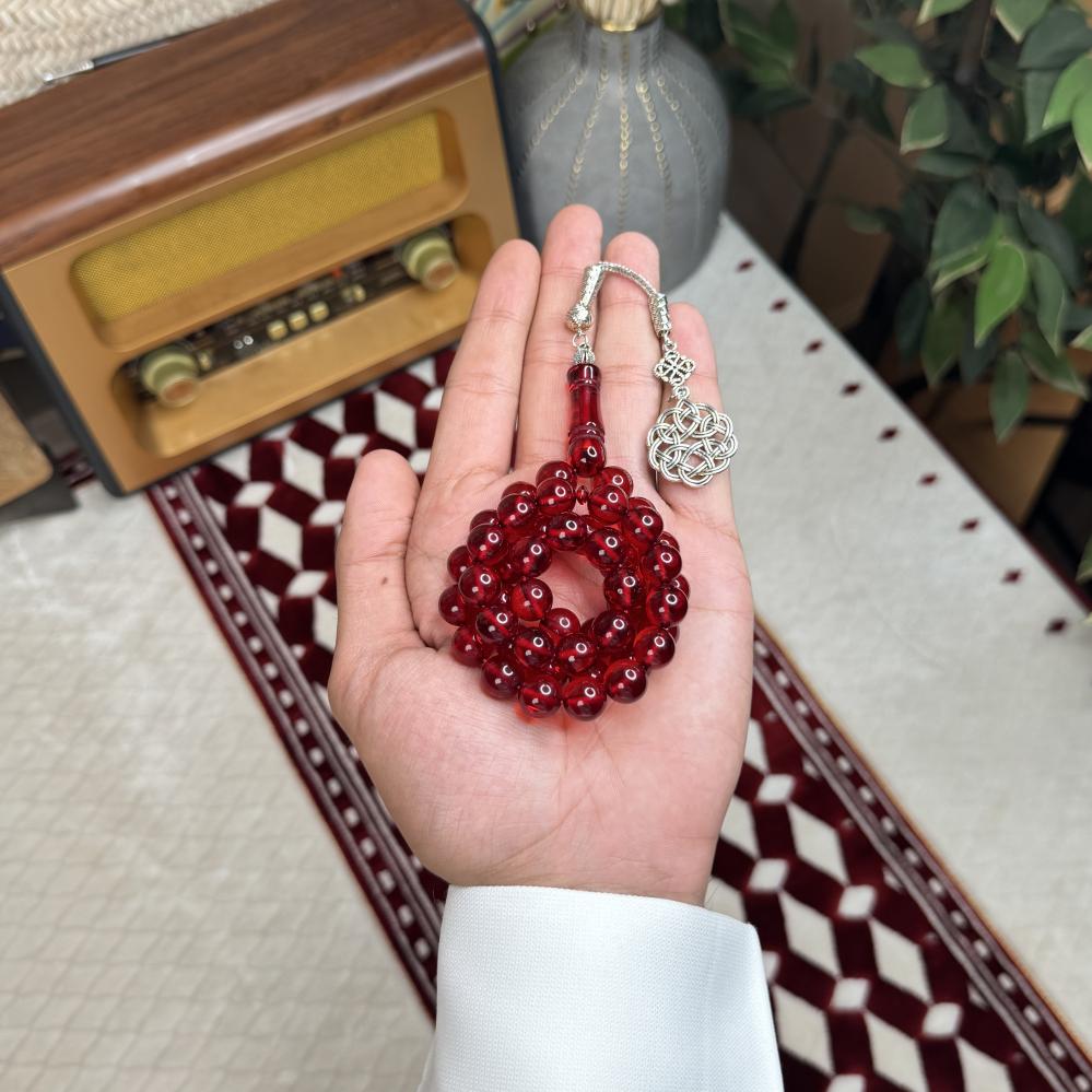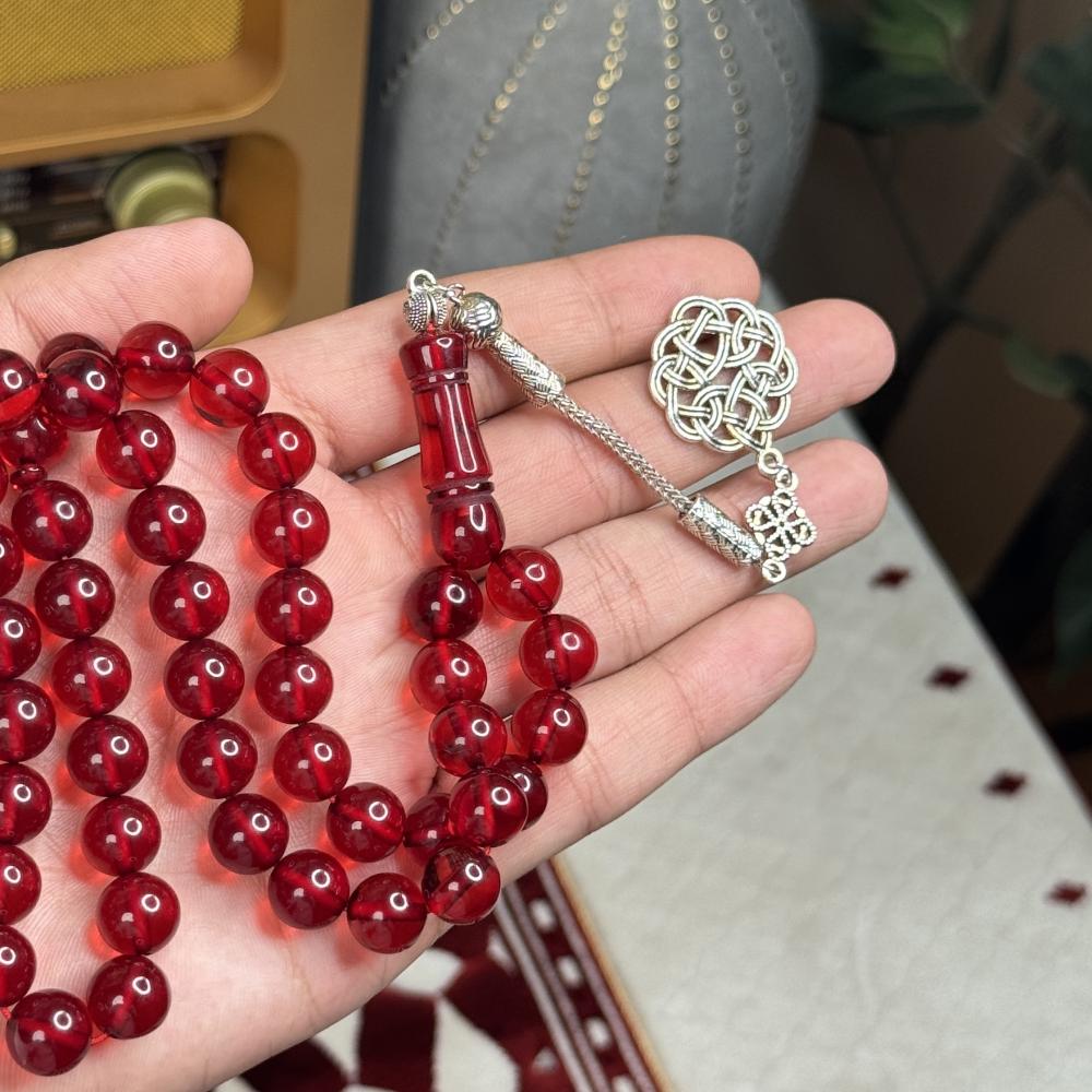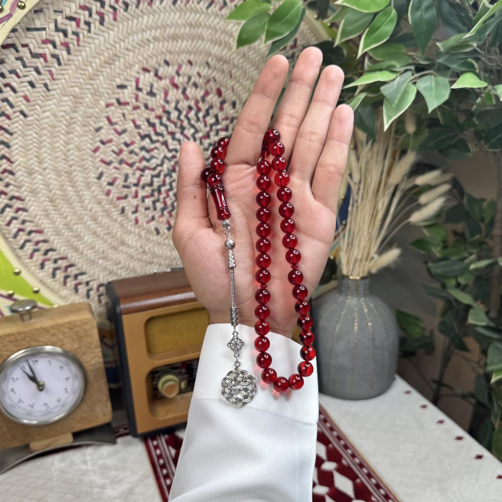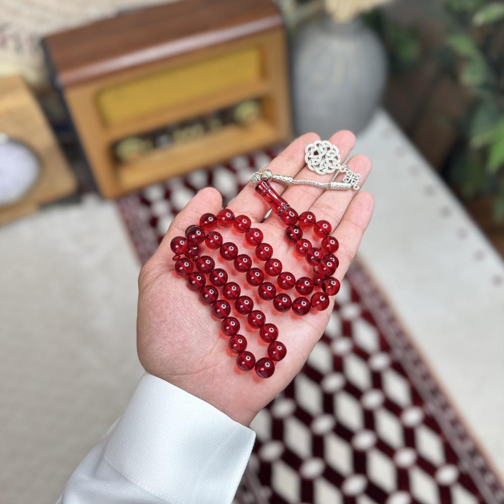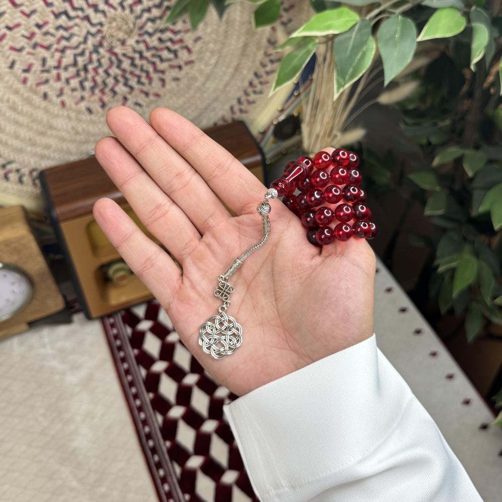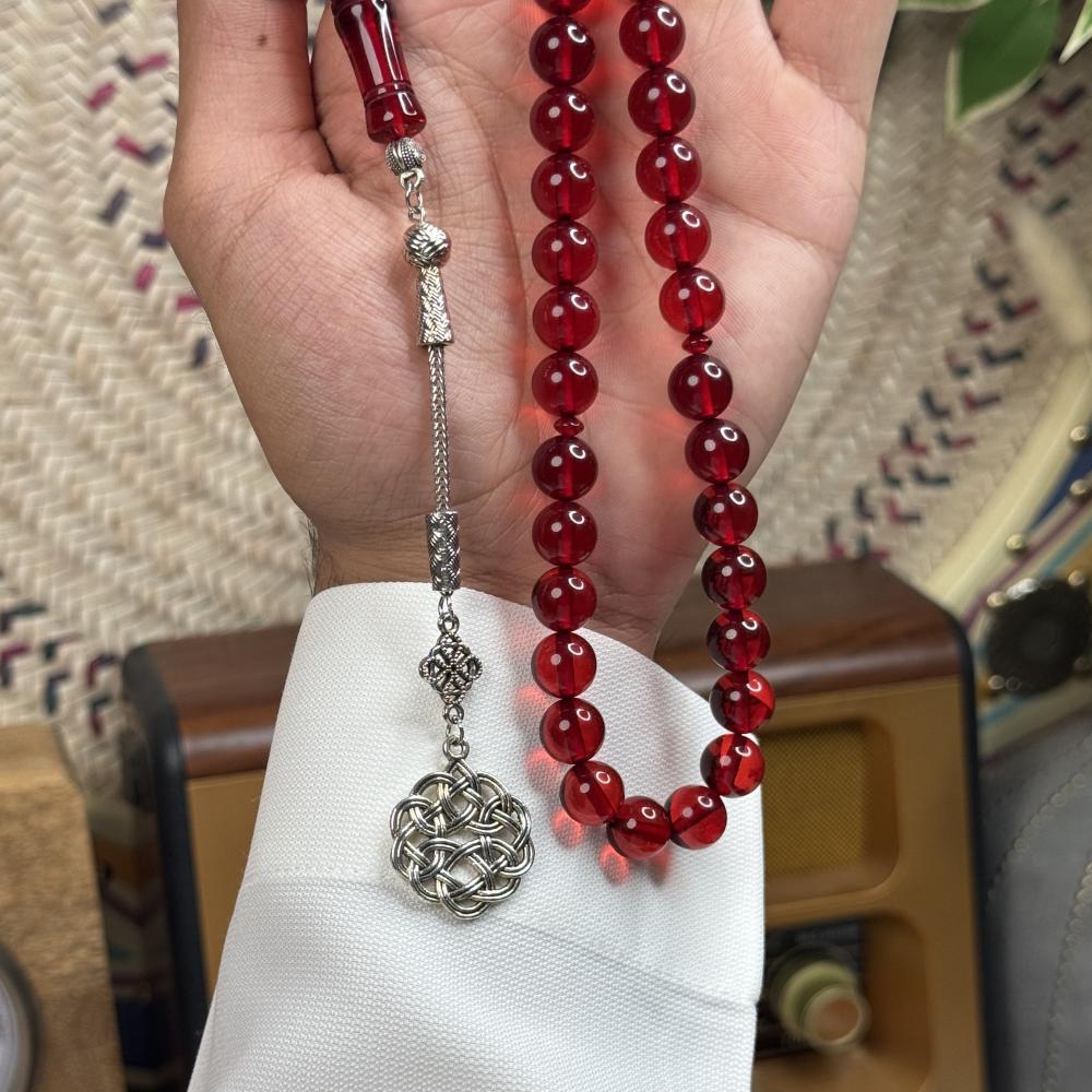 الخامة مايسمى بالبكلايت خفيفة الوزن مصممة للاستخدام اليومي، تتميز بتصميم مريح وأنيق و عصري ، عليها طربزونة معدنية مصنوعة يدوياً مما يعطي السبحة جمال وفخامة وجمال