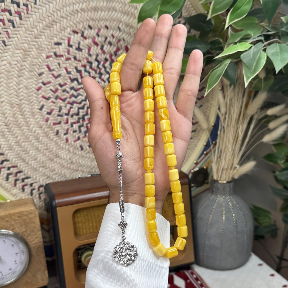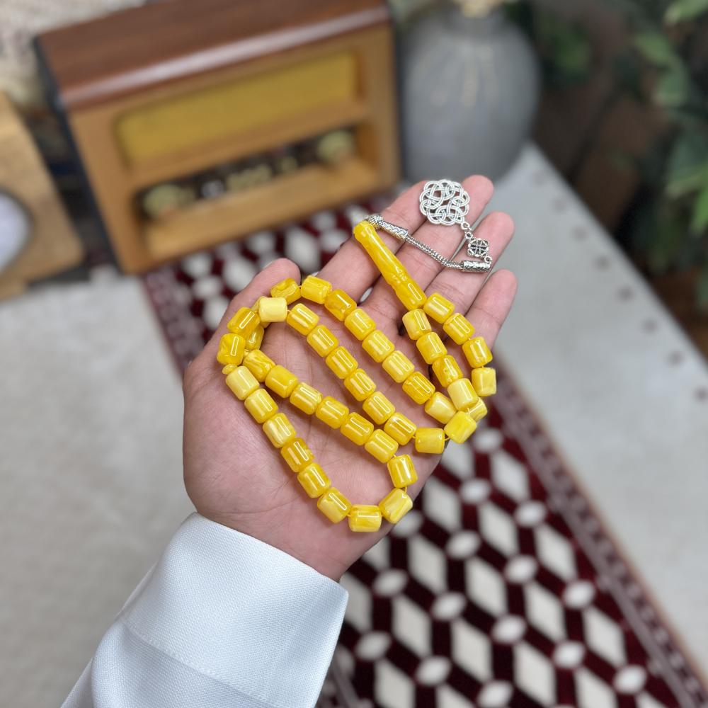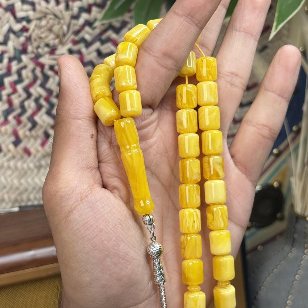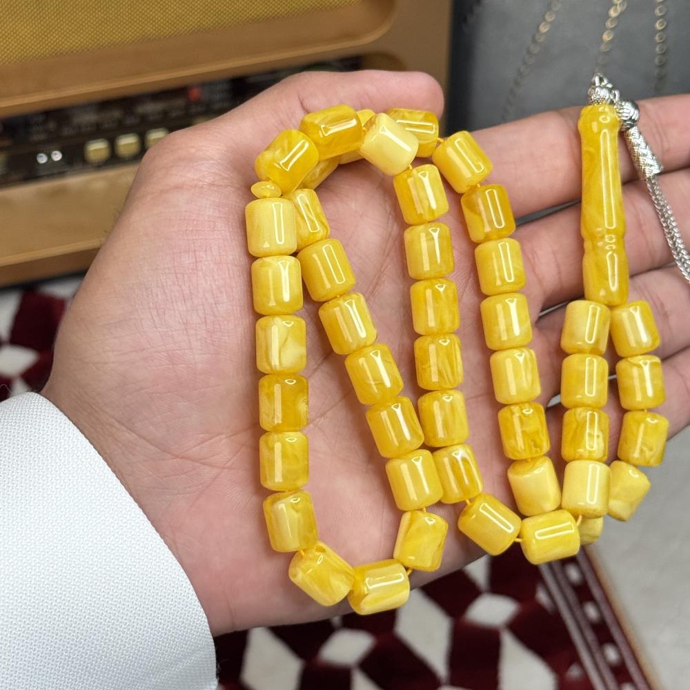 الخامة مايسمى بالبكلايت خفيفة الوزن مصممة للاستخدام اليومي، تتميز بتصميم مريح وأنيق و عصري ، عليها طربزونة معدنية مصنوعة يدوياً مما يعطي السبحة جمال وفخامة وجمال