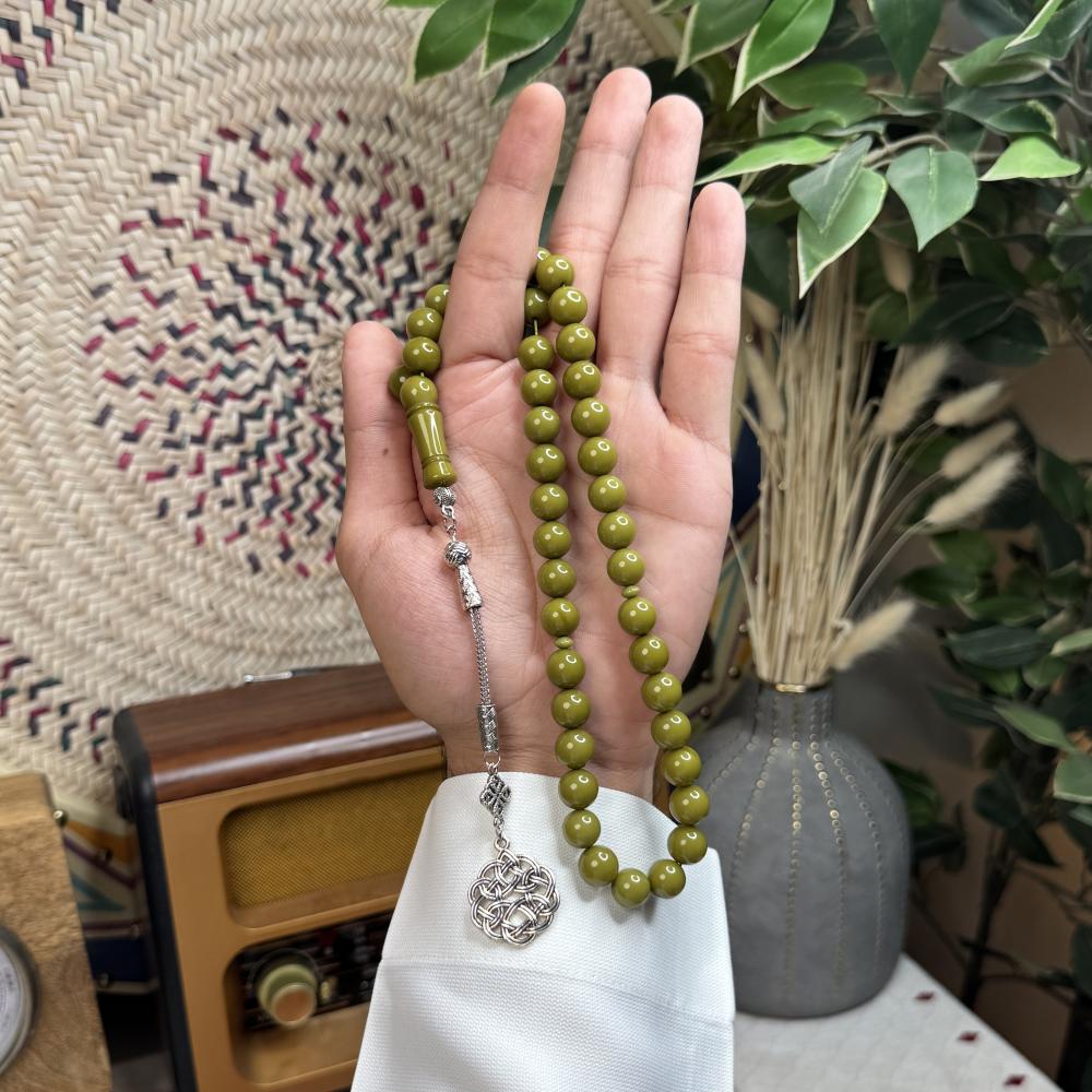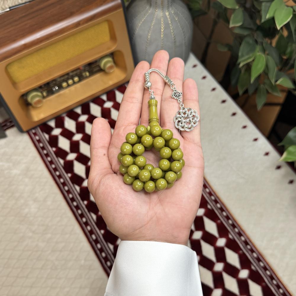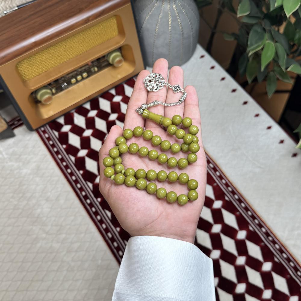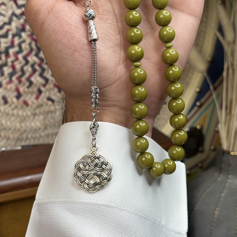 الخامة مايسمى بالبكلايت خفيفة الوزن مصممة للاستخدام اليومي، تتميز بتصميم مريح وأنيق و عصري ، عليها طربزونة معدنية مصنوعة يدوياً مما يعطي السبحة جمال وفخامة وجمال
