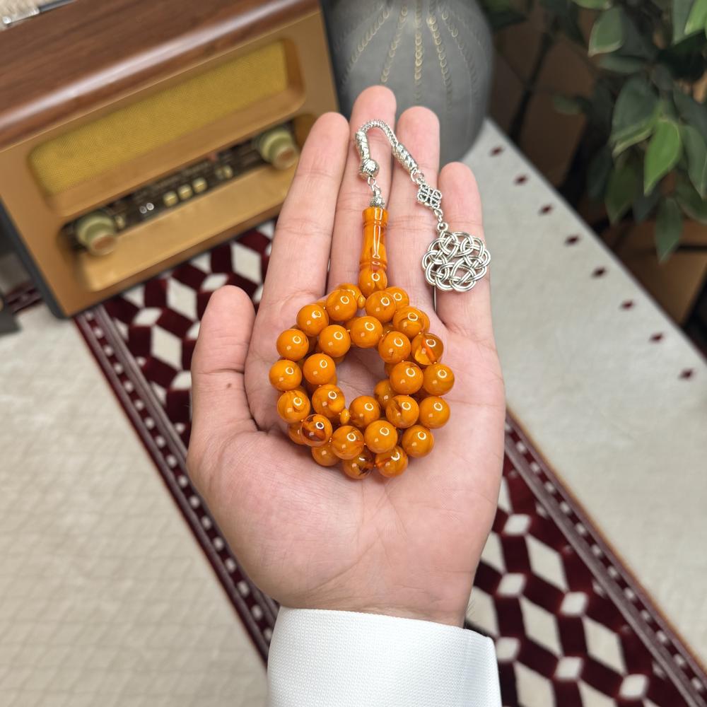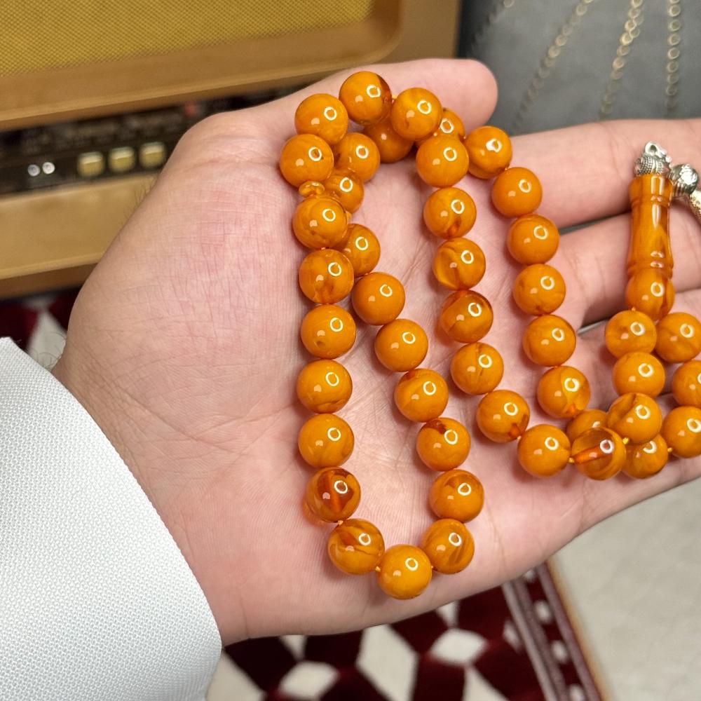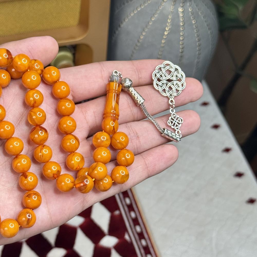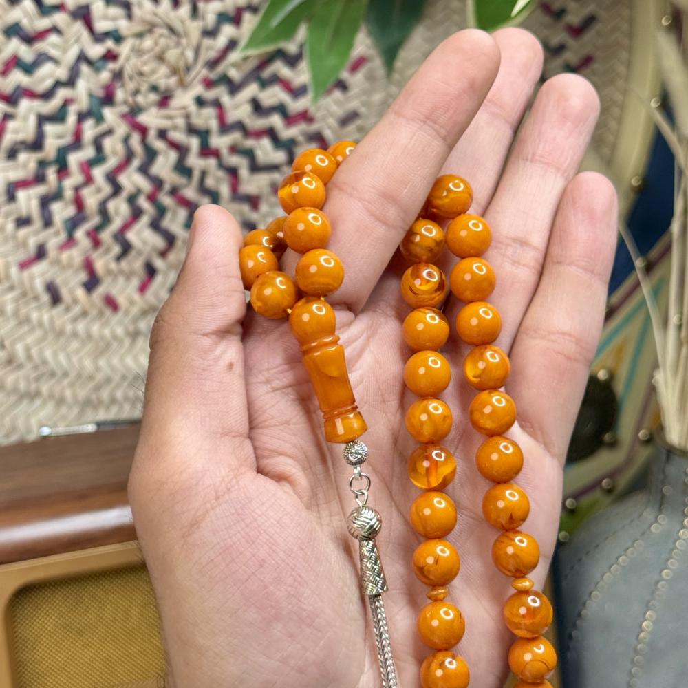 الخامة مايسمى بالبكلايت خفيفة الوزن مصممة للاستخدام اليومي، تتميز بتصميم مريح وأنيق و عصري ، عليها طربزونة معدنية مصنوعة يدوياً مما يعطي السبحة جمال وفخامة وجمال