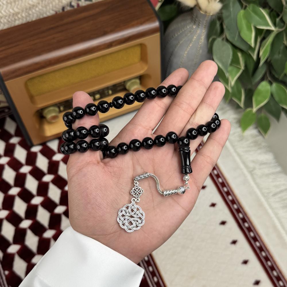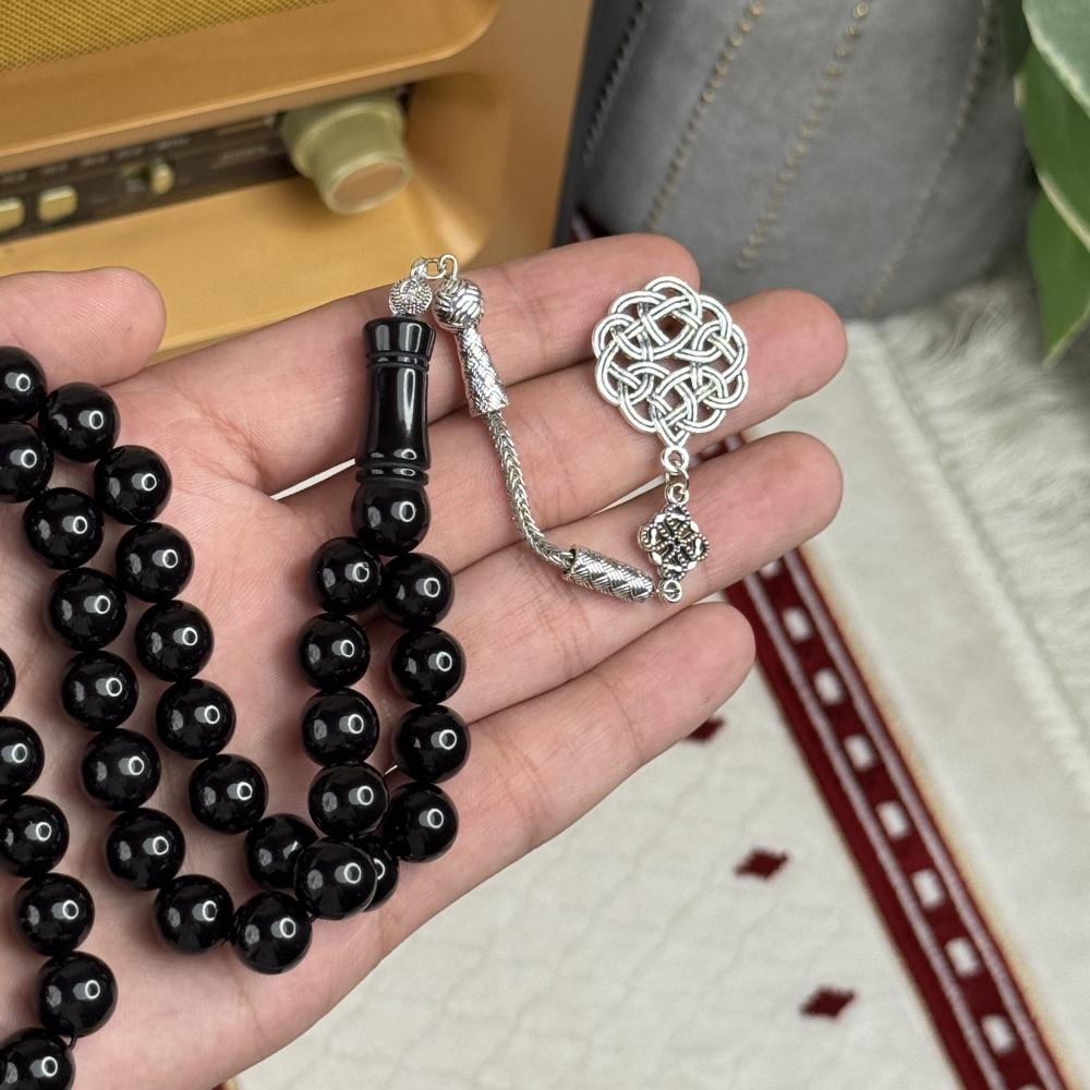 الخامة مايسمى بالبكلايت خفيفة الوزن مصممة للاستخدام اليومي، تتميز بتصميم مريح وأنيق و عصري ، عليها طربزونة معدنية مصنوعة يدوياً مما يعطي السبحة جمال وفخامة وجمال