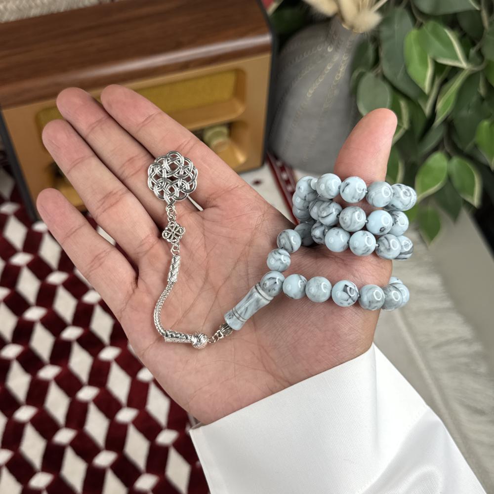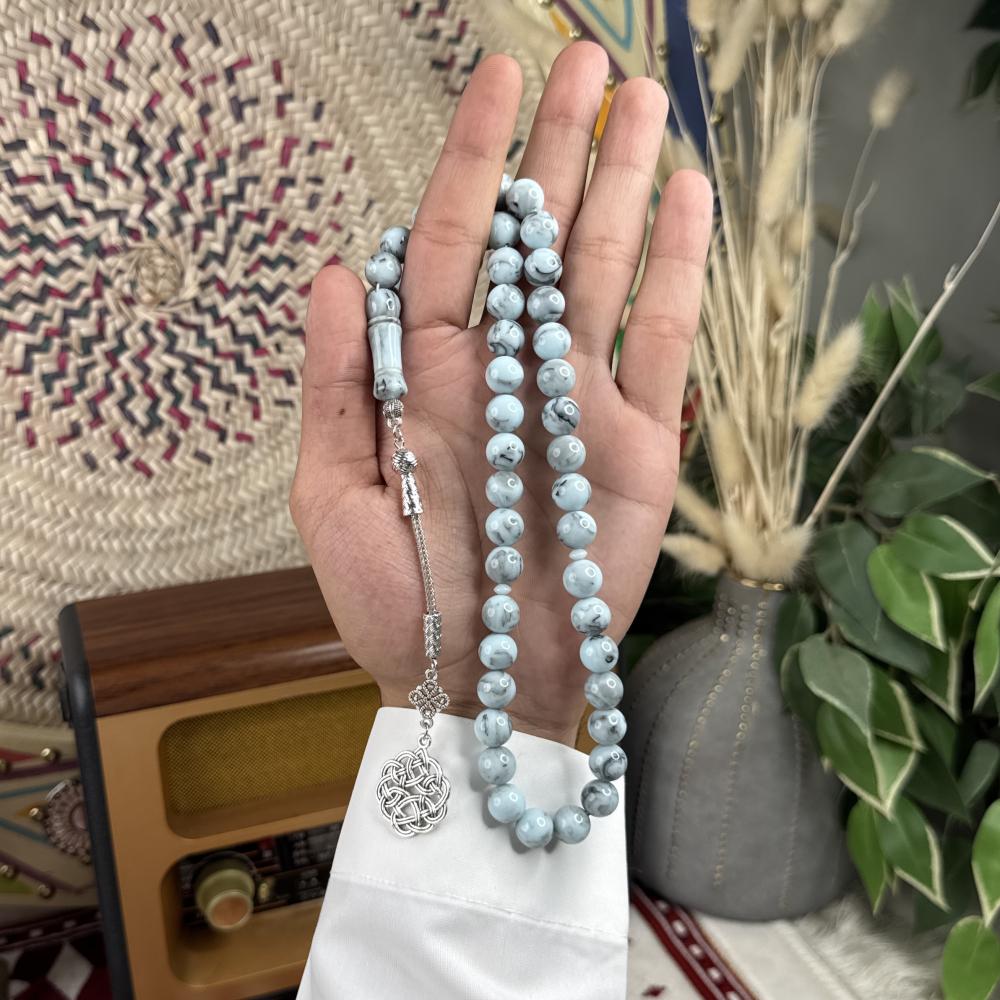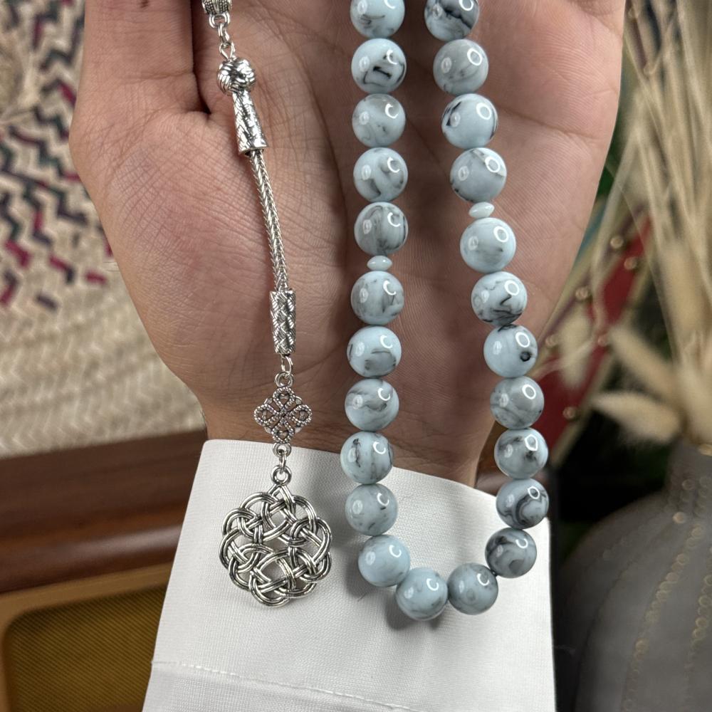 الخامة مايسمى بالبكلايت خفيفة الوزن مصممة للاستخدام اليومي، تتميز بتصميم مريح وأنيق و عصري ، عليها طربزونة معدنية مصنوعة يدوياً مما يعطي السبحة جمال وفخامة وجمال