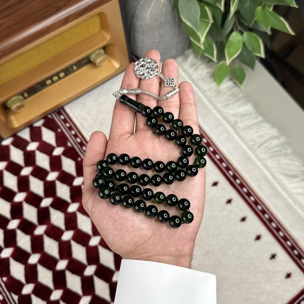 الخامة مايسمى بالبكلايت خفيفة الوزن مصممة للاستخدام اليومي، تتميز بتصميم مريح وأنيق و عصري ، عليها طربزونة معدنية مصنوعة يدوياً مما يعطي السبحة جمال وفخامة وجمال