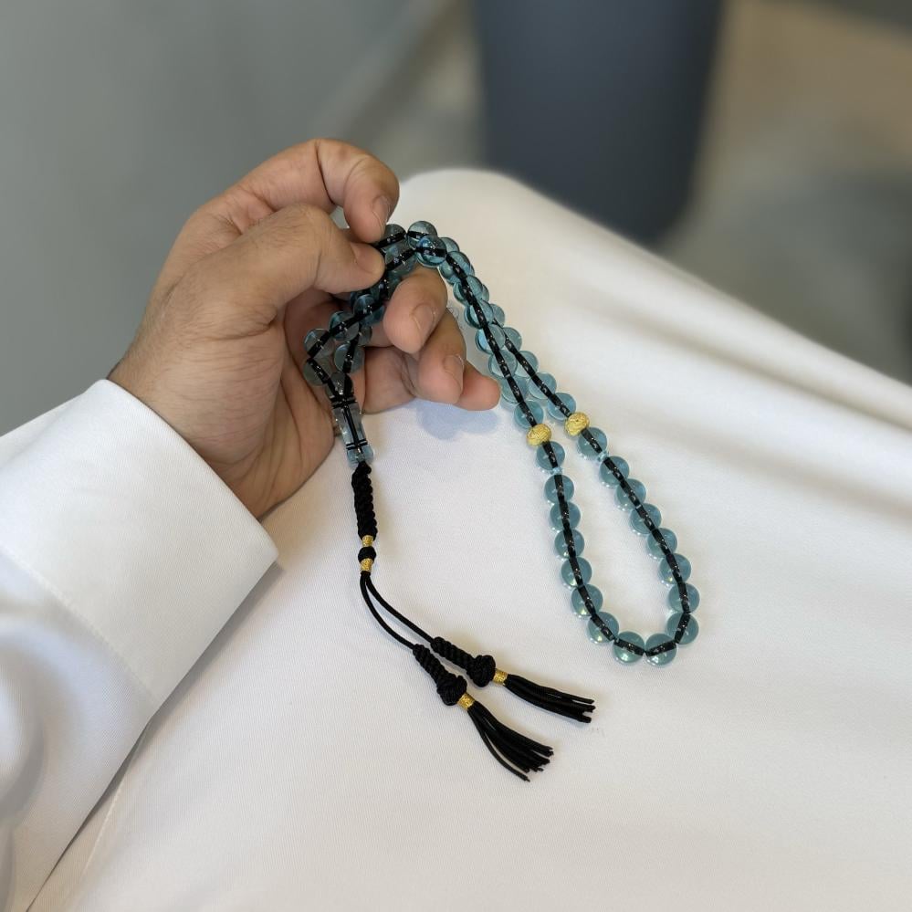الخامة مايسمى بالبكلايت خفيفة الوزن مصممة للاستخدام اليومي، تتميز بتصميم مريح وأنيق، عليها كركوشة حياكة يدوية وفواصل فضة مطلي ذهب عيار 24 يعطي السبحة جمال وفخامة.