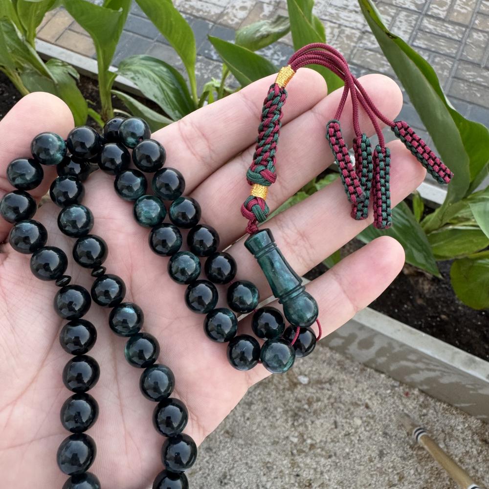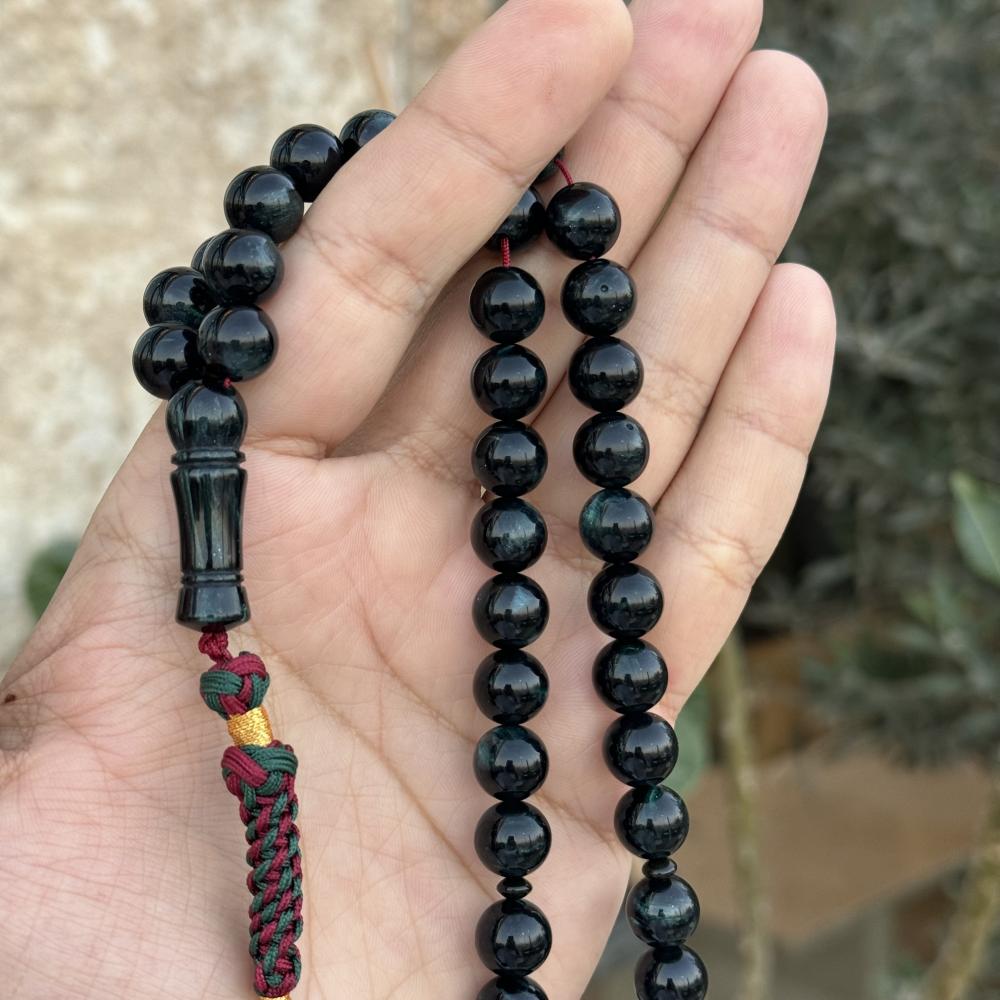 الخامة مايسمى بالبكلايت خفيفة الوزن مصممة للاستخدام اليومي، تتميز بتصميم مريح وأنيق، عليها كركوشة حياكة يدوية مما يعطي السبحة جمال وفخامة.