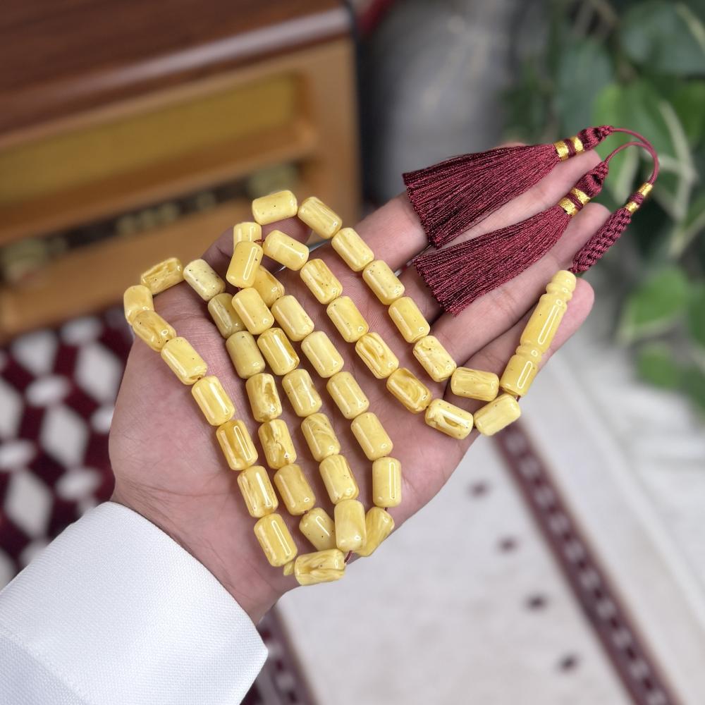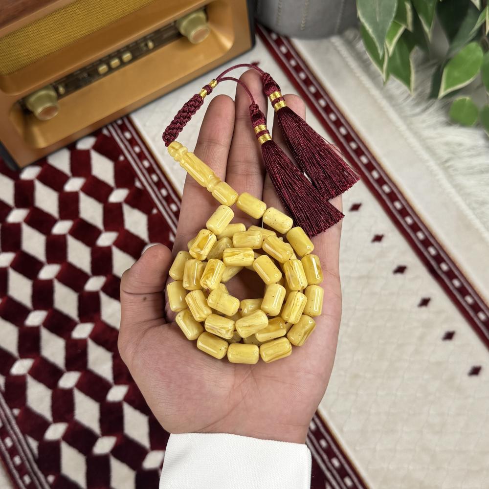 الخامة مايسمى بالبكلايت خفيفة الوزن مصممة للاستخدام اليومي، تتميز بتصميم مريح وأنيق، عليها كركوشة حياكة يدوية مما يعطي السبحة جمال وفخامة.