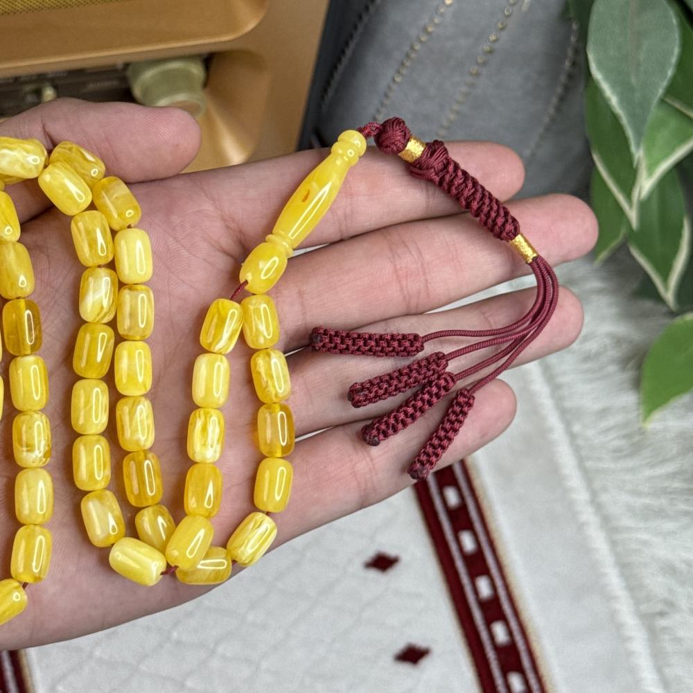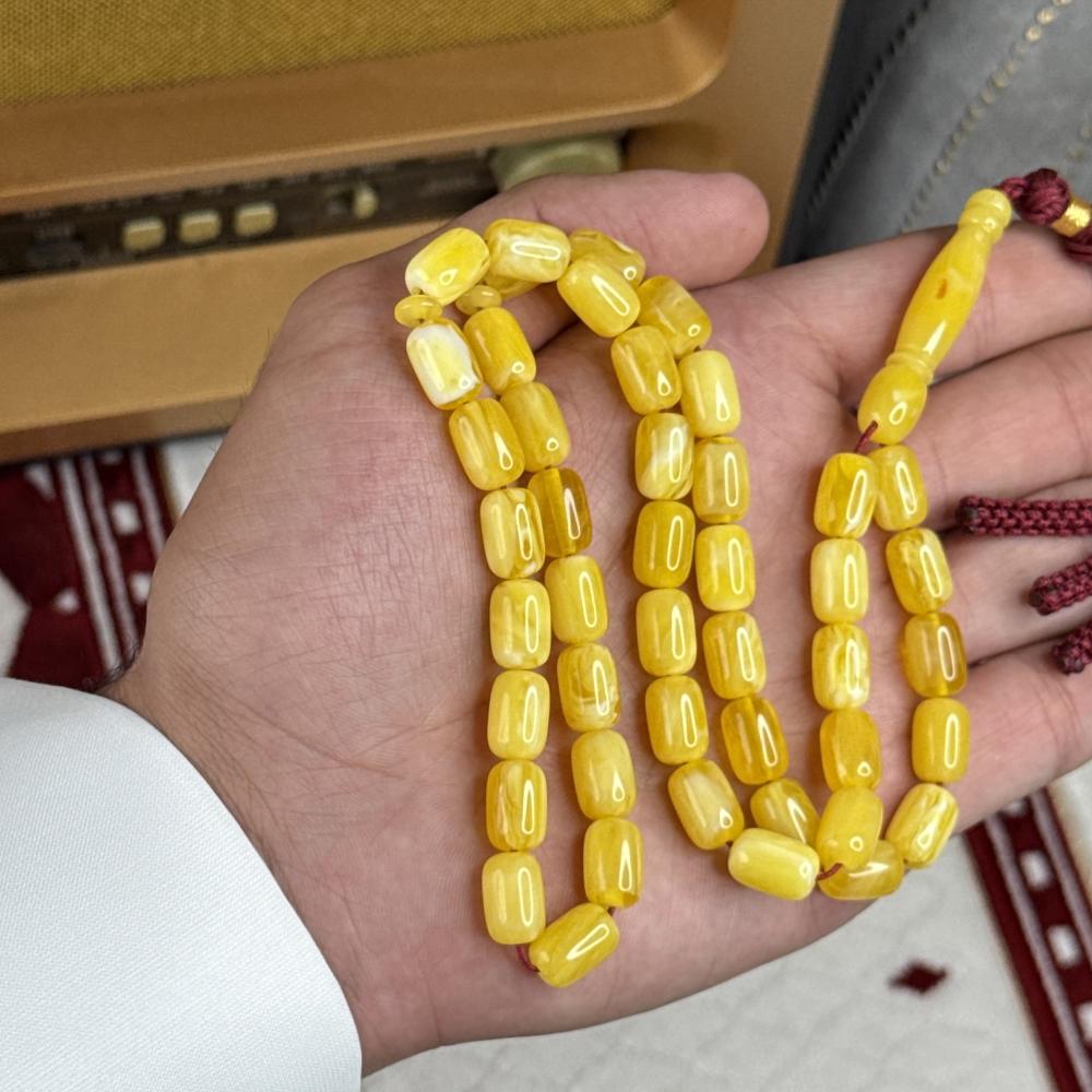 الخامة مايسمى بالبكلايت خفيفة الوزن مصممة للاستخدام اليومي، تتميز بتصميم مريح وأنيق، عليها كركوشة حياكة يدوية مما يعطي السبحة جمال وفخامة.
