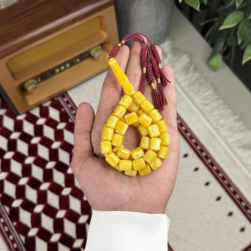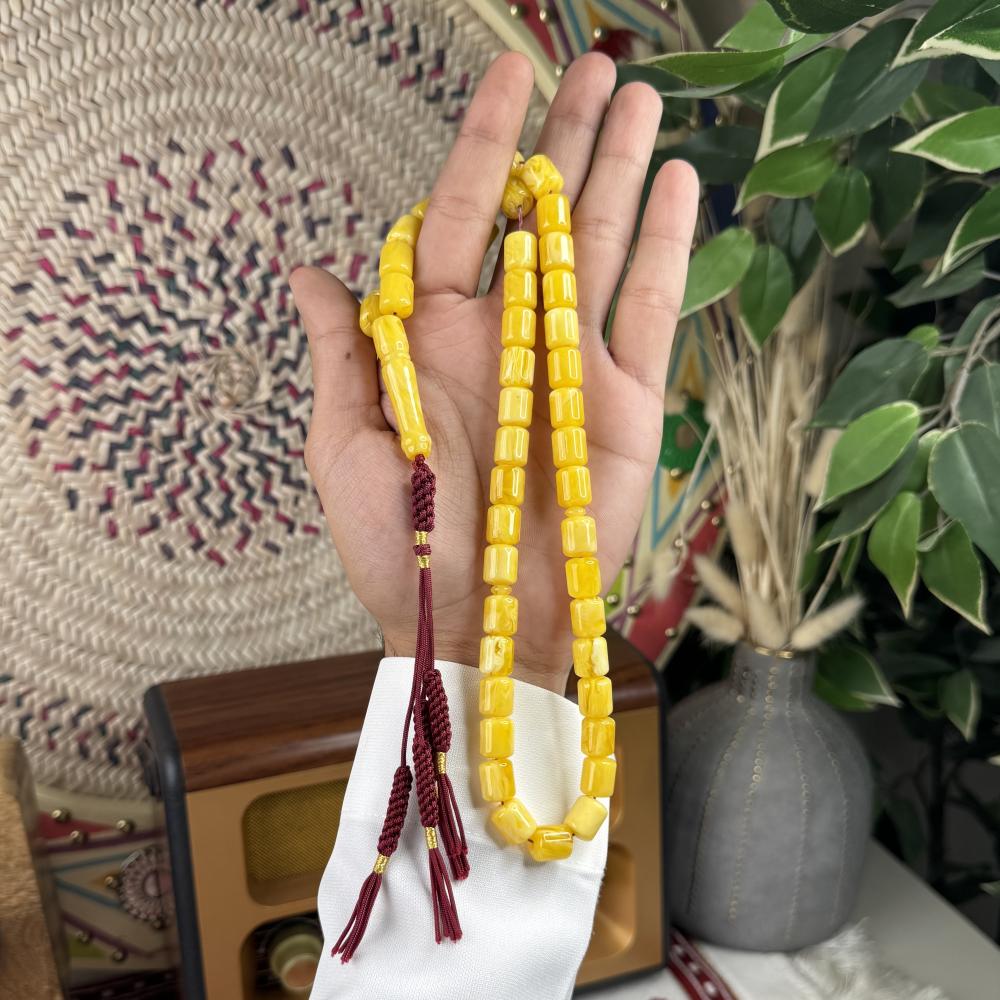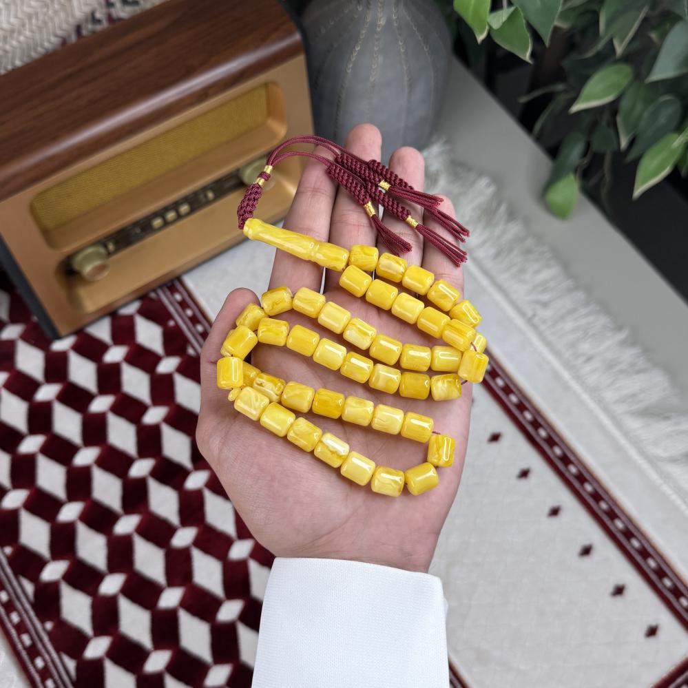 الخامة مايسمى بالبكلايت خفيفة الوزن مصممة للاستخدام اليومي، تتميز بتصميم مريح وأنيق، عليها كركوشة حياكة يدوية مما يعطي السبحة جمال وفخامة.