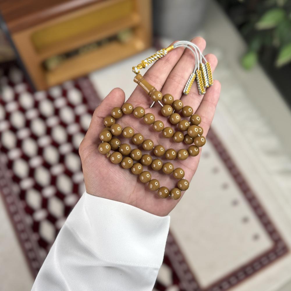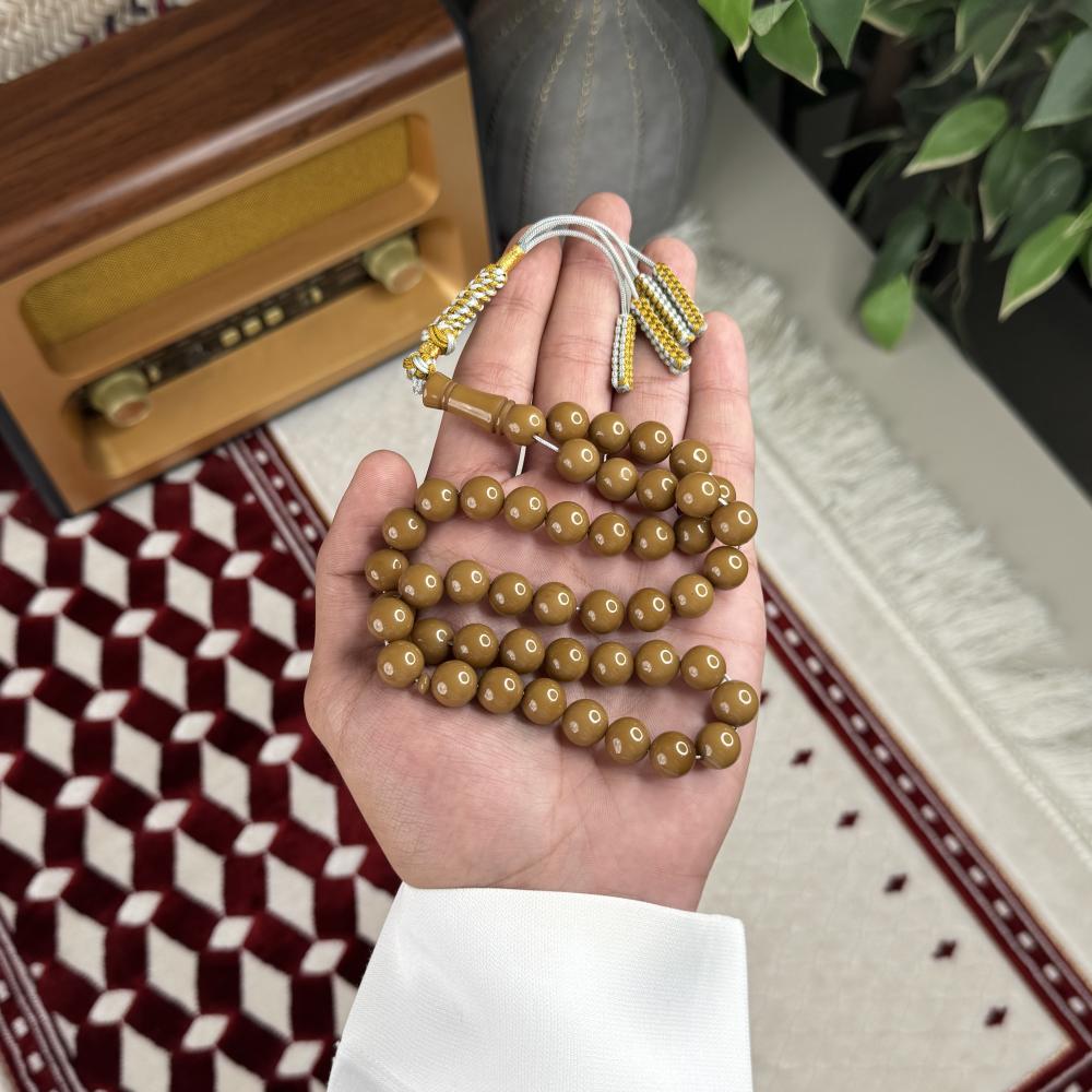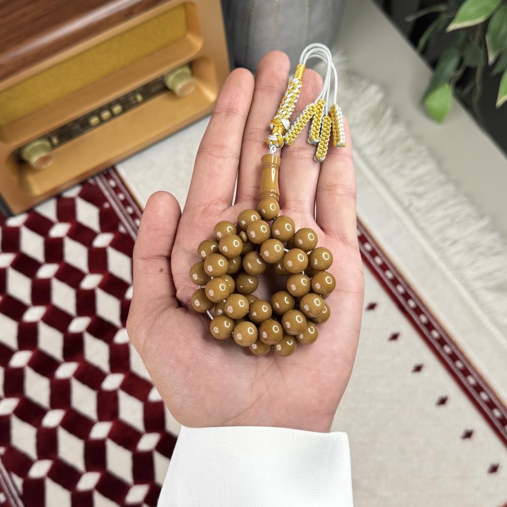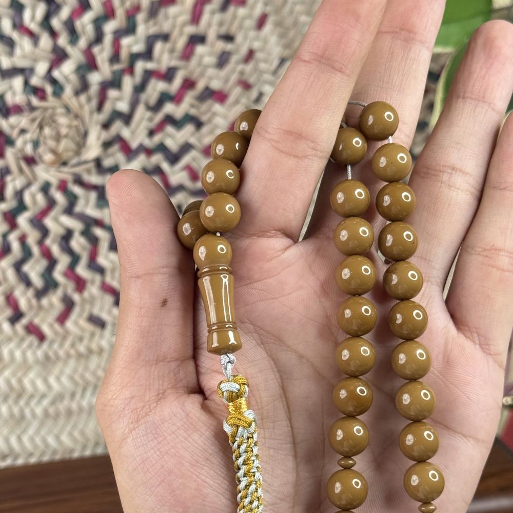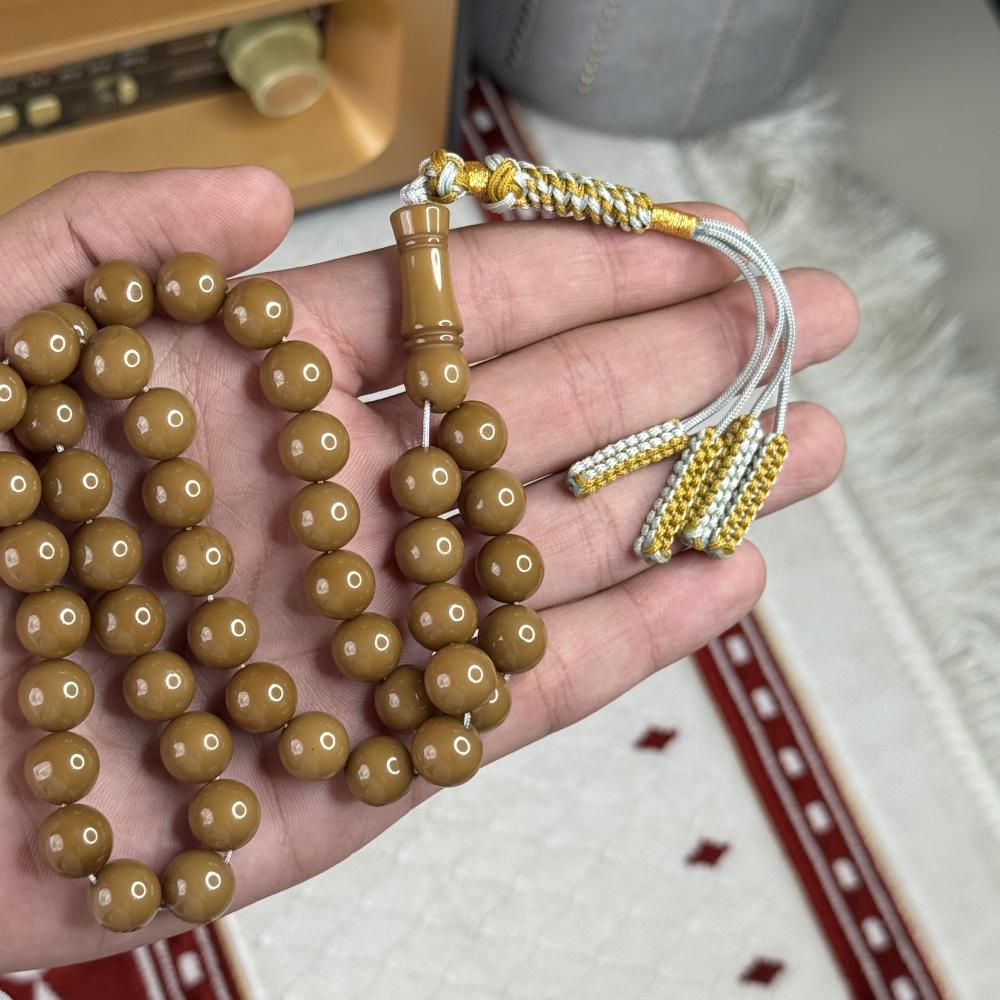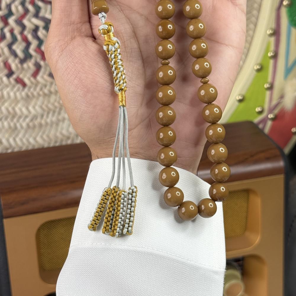 الخامة مايسمى بالبكلايت خفيفة الوزن مصممة للاستخدام اليومي، تتميز بتصميم مريح وأنيق، عليها كركوشة حياكة يدوية مما يعطي السبحة جمال وفخامة.
