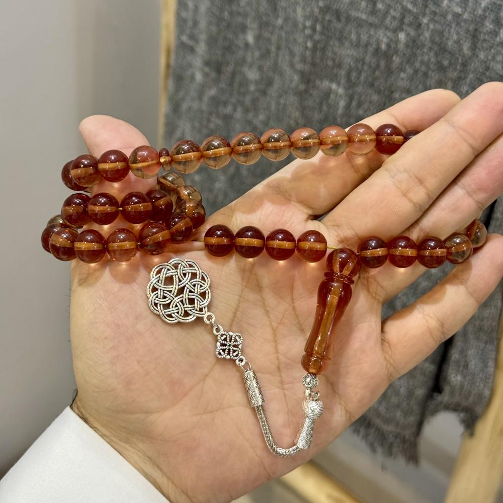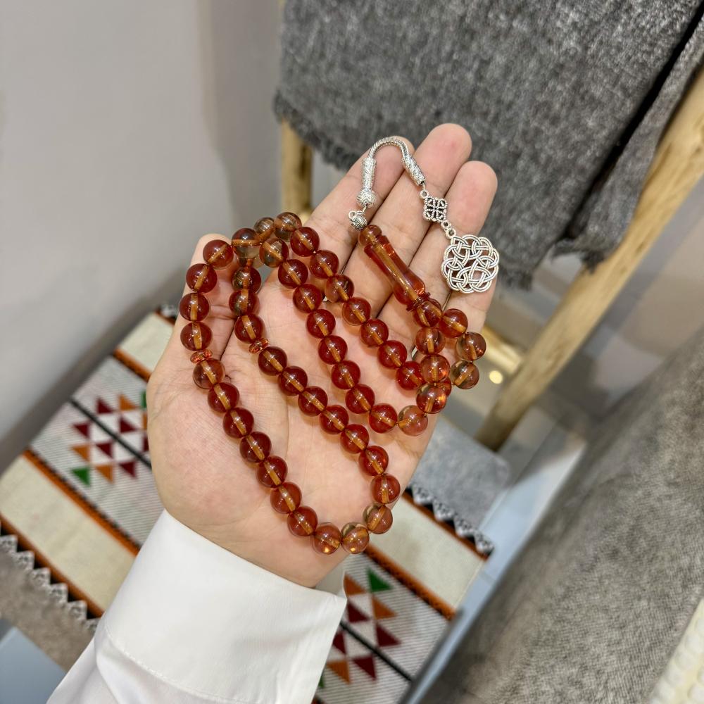 سبحة زعفرانية تتميز بخامة مايسمى بالزعفرانية خفيفة الوزن مصممة للاستخدام اليومي، تتميز بتصميم مريح وأنيق، عليها طربزونة معدنية مما يعطي السبحة جمال وفخامة.