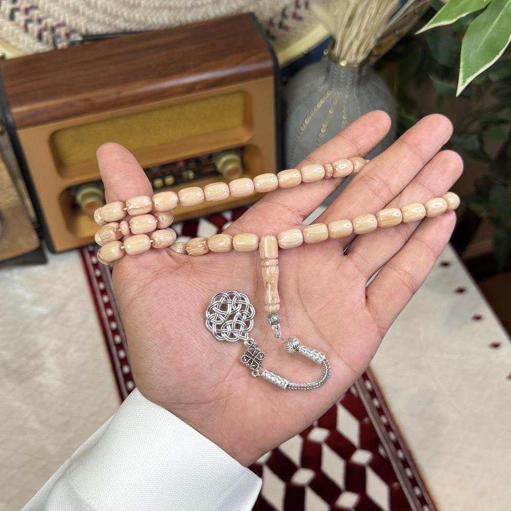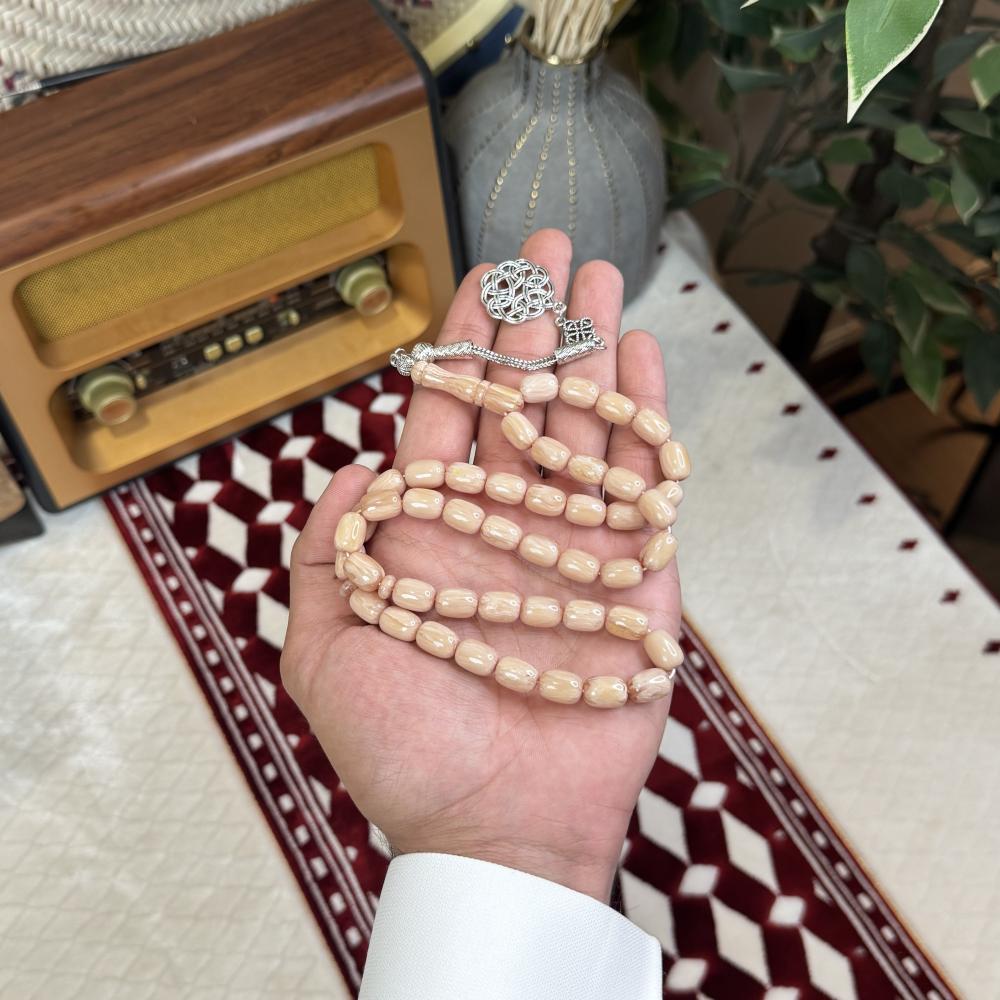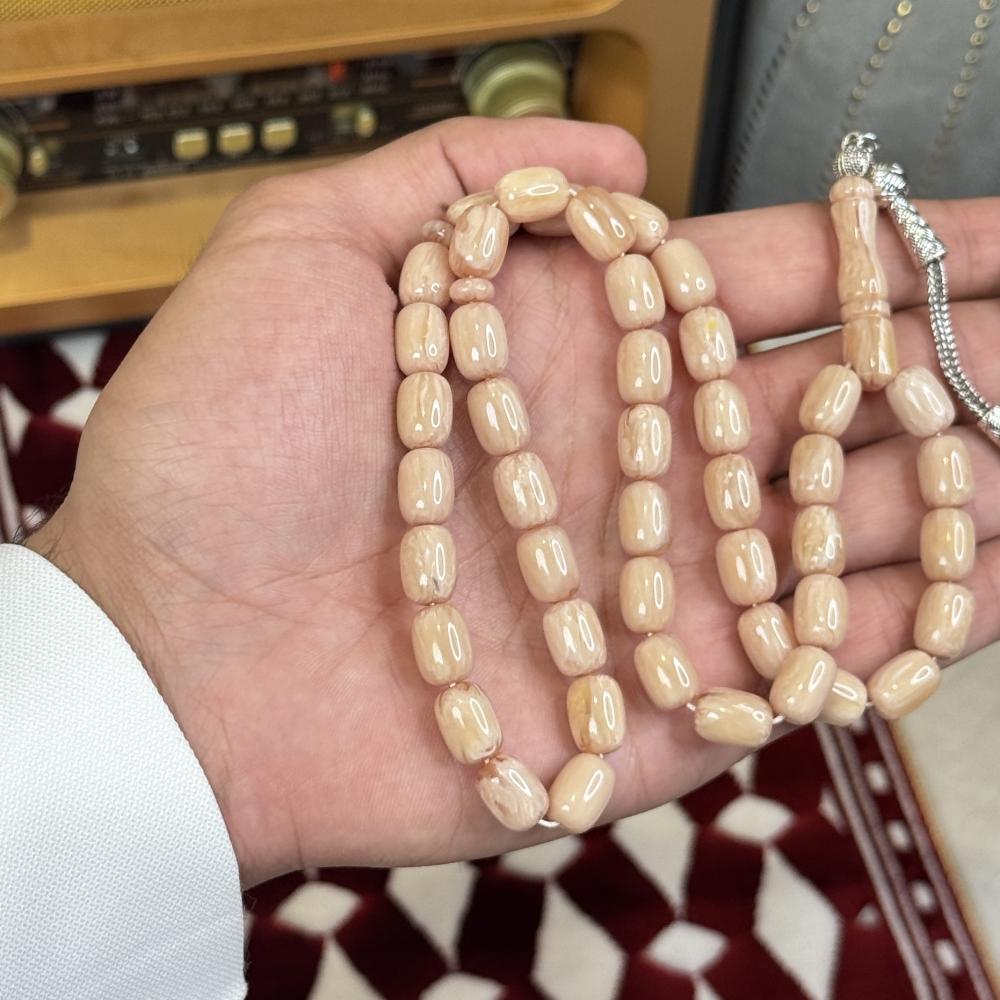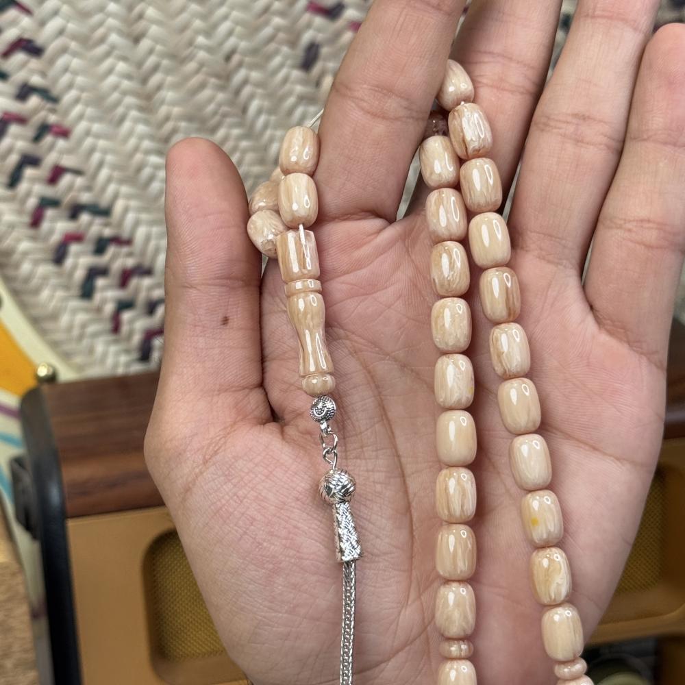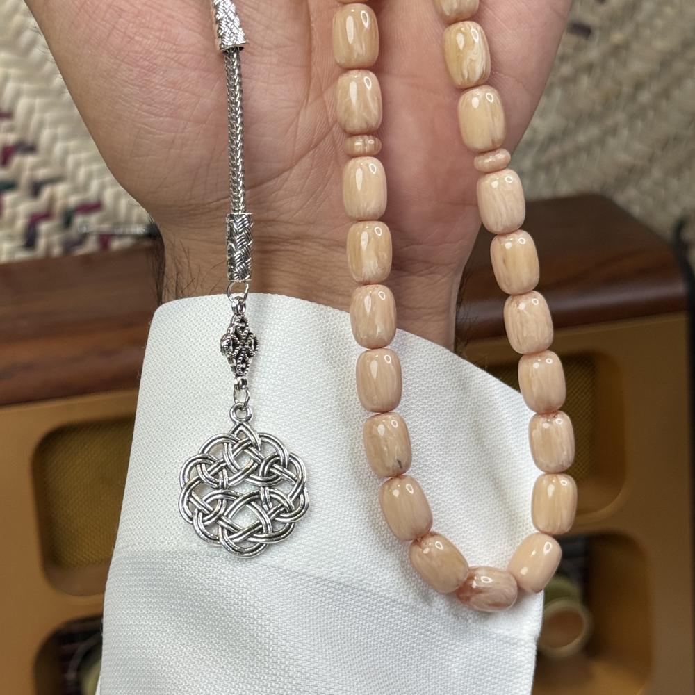 الخامة مايسمى بالفاتوران خفيفة الوزن مصممة للاستخدام اليومي، تتميز بتصميم مريح وأنيق، عليها طربزونة معدنية مصنوعة يدوياً مما يعطي السبحة جمال وفخامة.