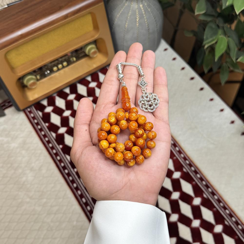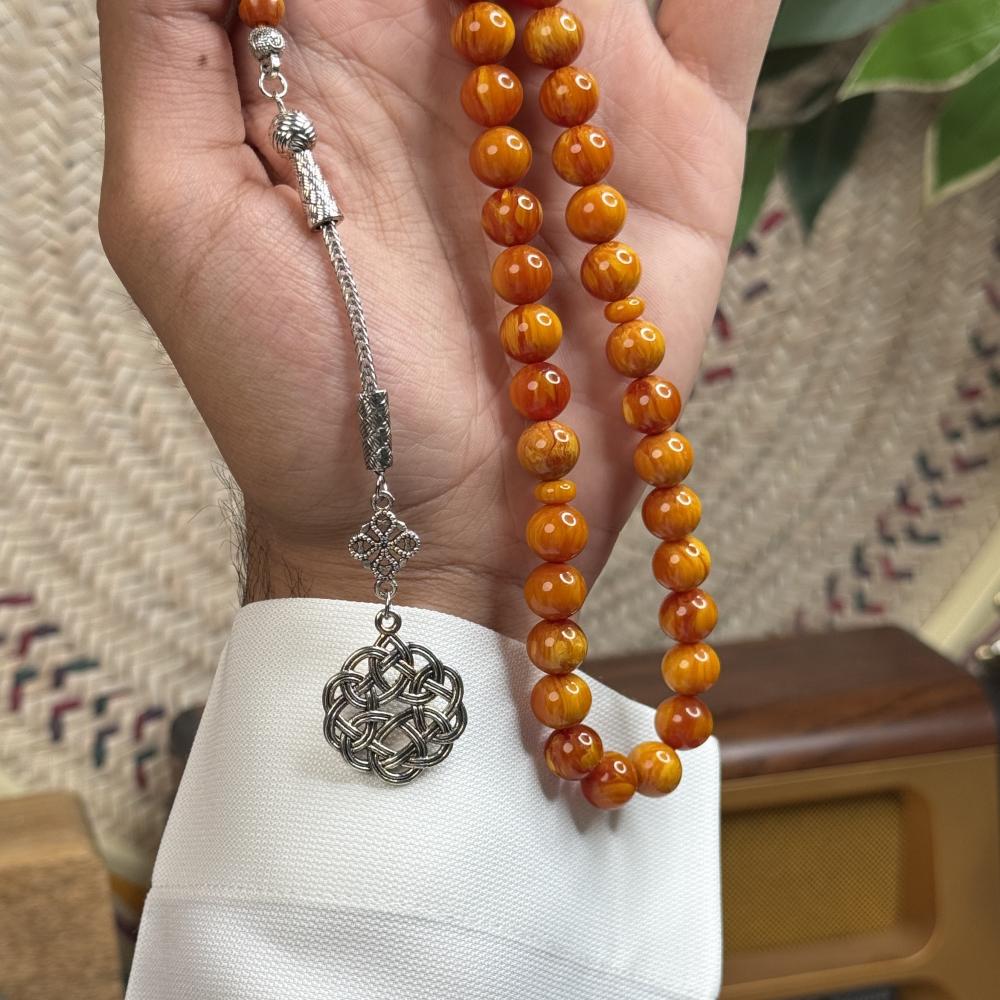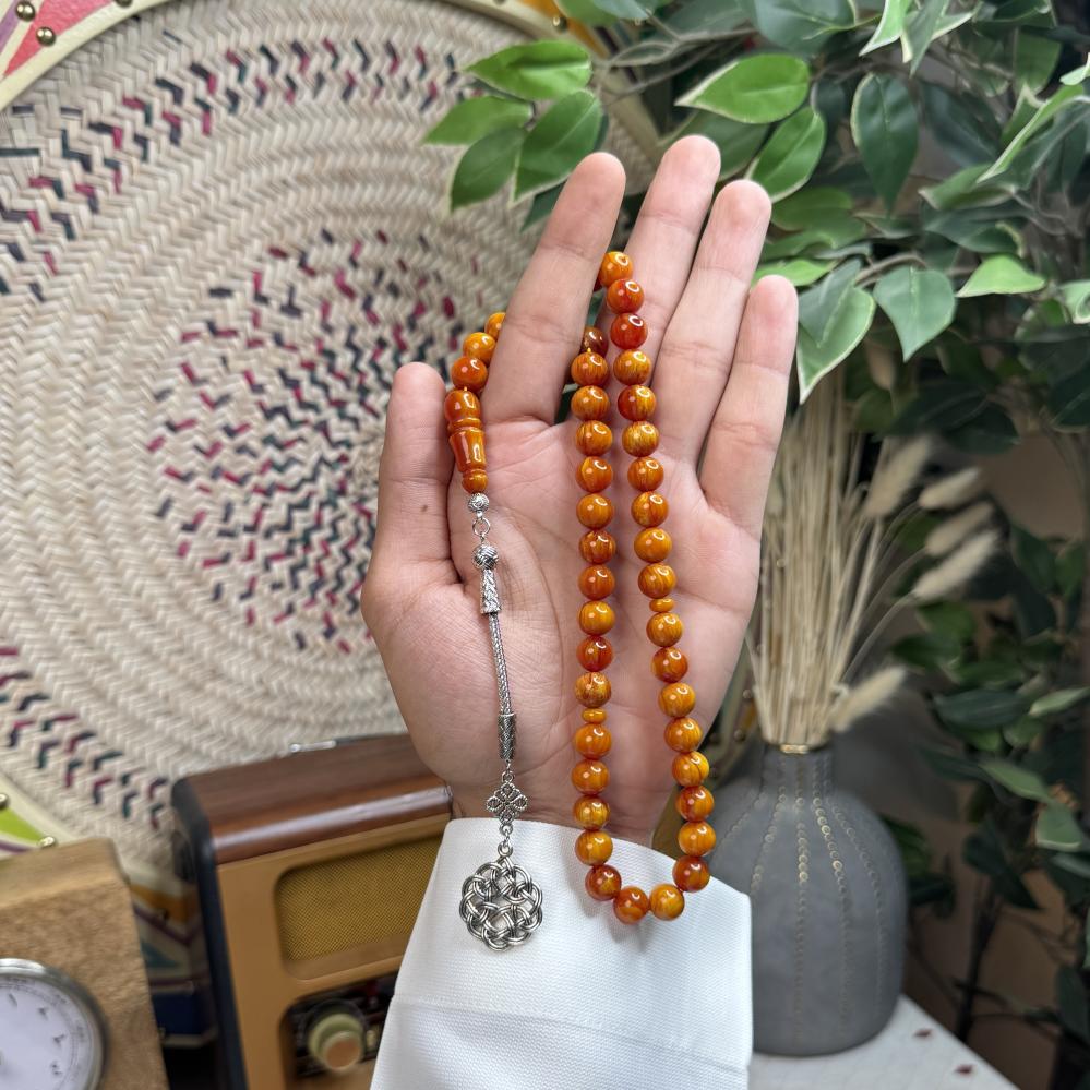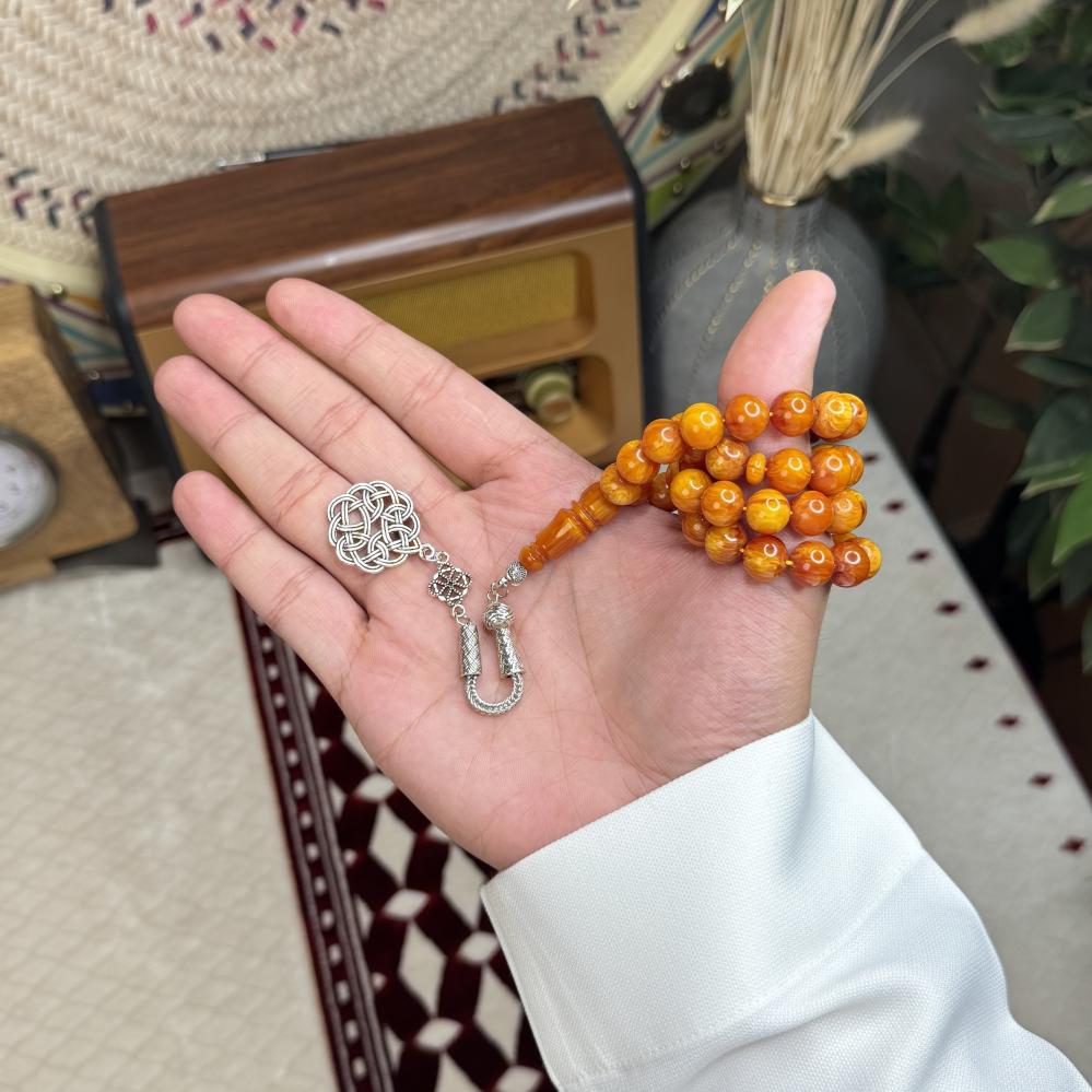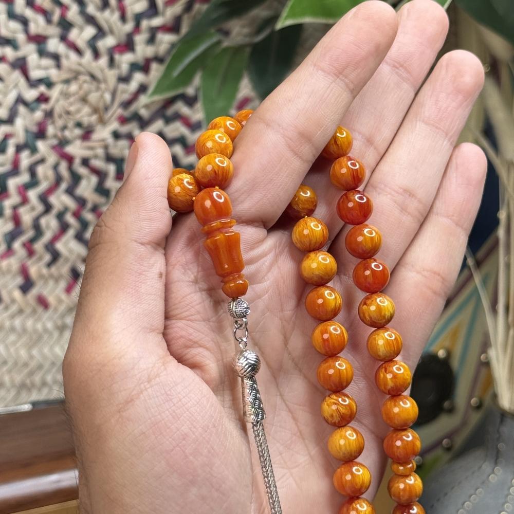 الخامة مايسمى بالفاتوران خفيفة الوزن مصممة للاستخدام اليومي، تتميز بتصميم مريح وأنيق، عليها طربزونة معدنية مصنوعة يدوياً مما يعطي السبحة جمال وفخامة.