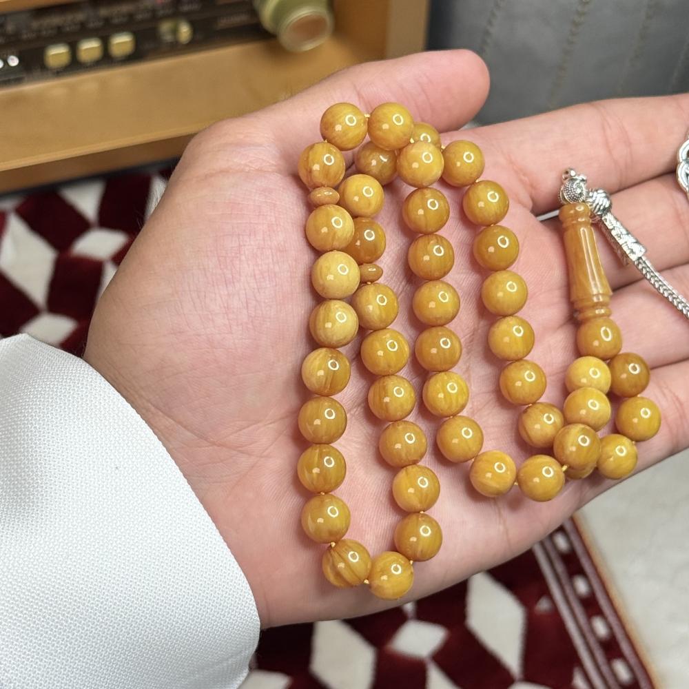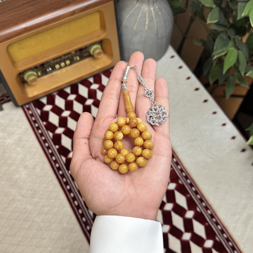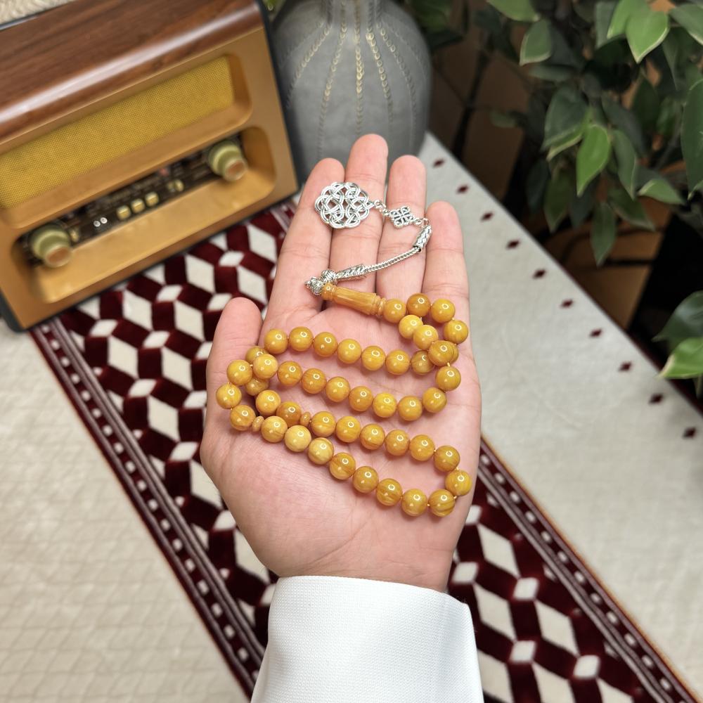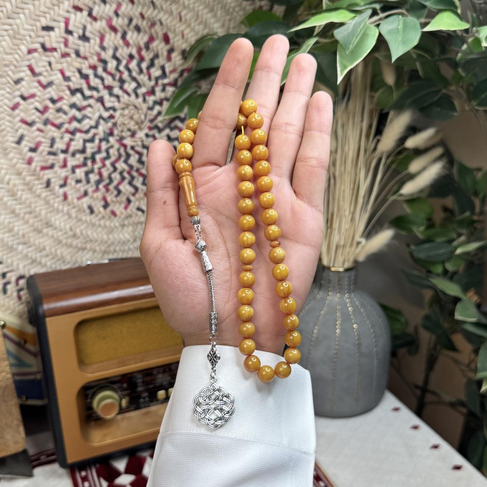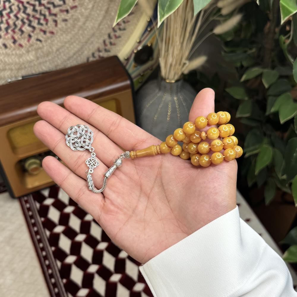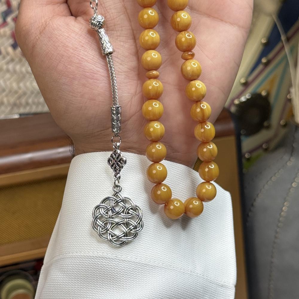 الخامة مايسمى بالفاتوران خفيفة الوزن مصممة للاستخدام اليومي، تتميز بتصميم مريح وأنيق، عليها طربزونة معدنية مصنوعة يدوياً مما يعطي السبحة جمال وفخامة.