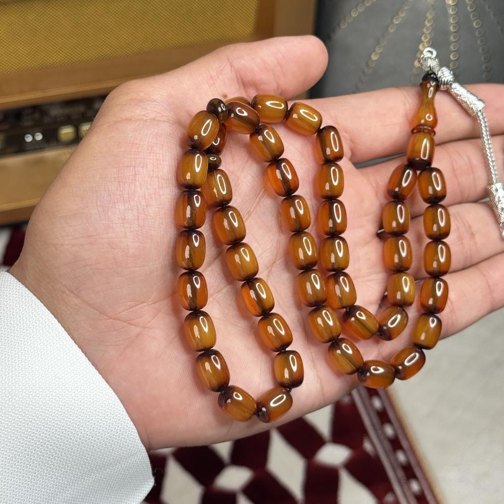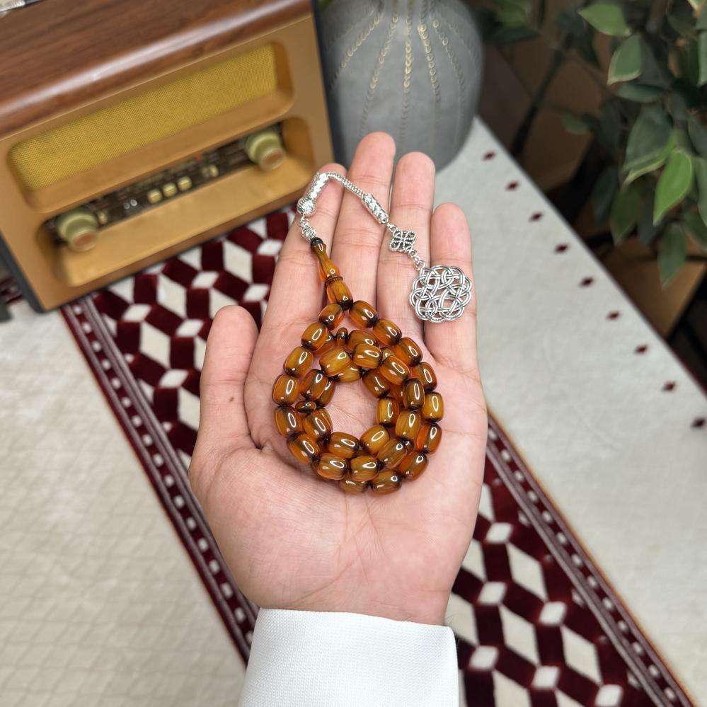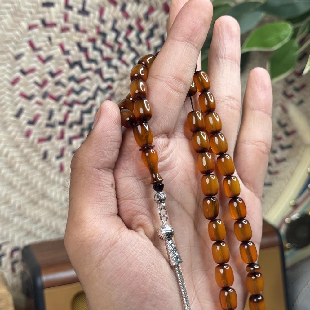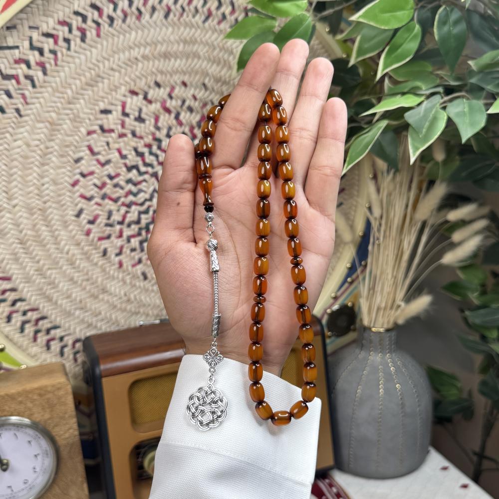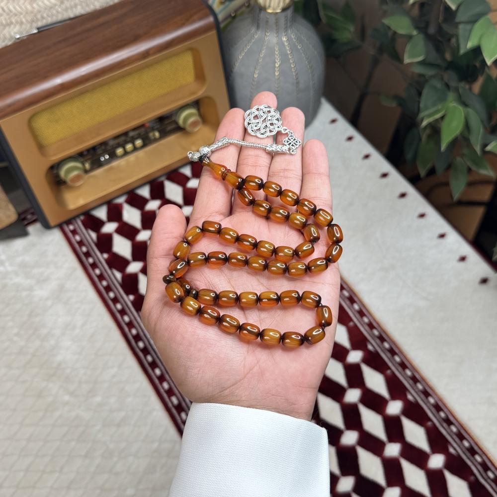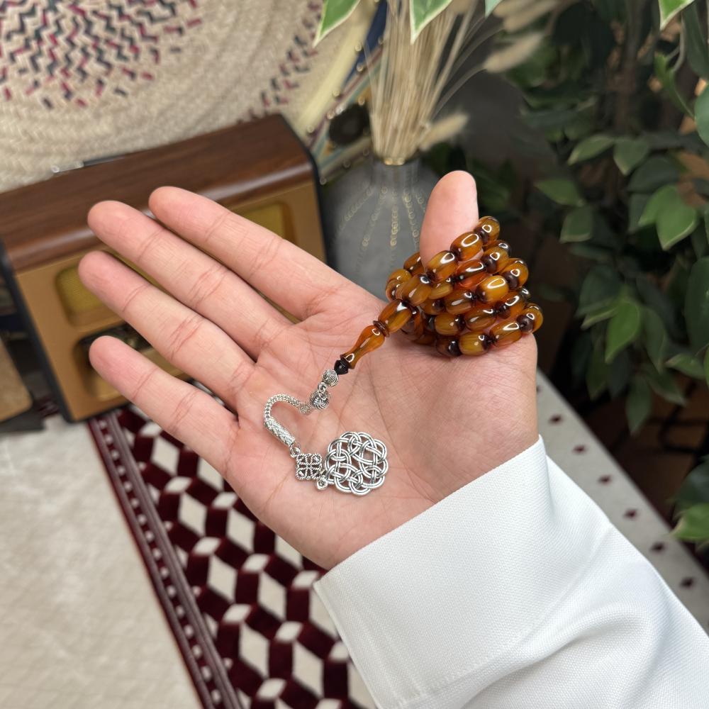 الخامة مايسمى بالفاتوران خفيفة الوزن مصممة للاستخدام اليومي، تتميز بتصميم مريح وأنيق، عليها طربزونة معدنية مصنوعة يدوياً مما يعطي السبحة جمال وفخامة.
